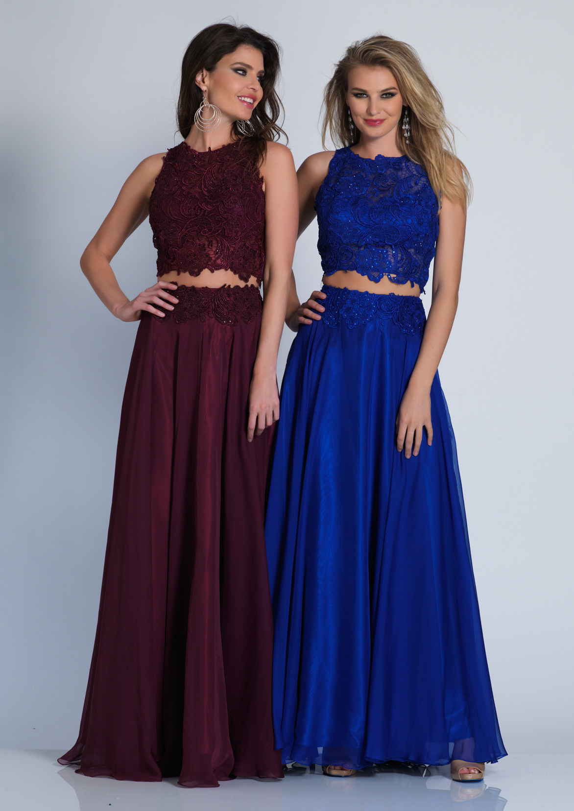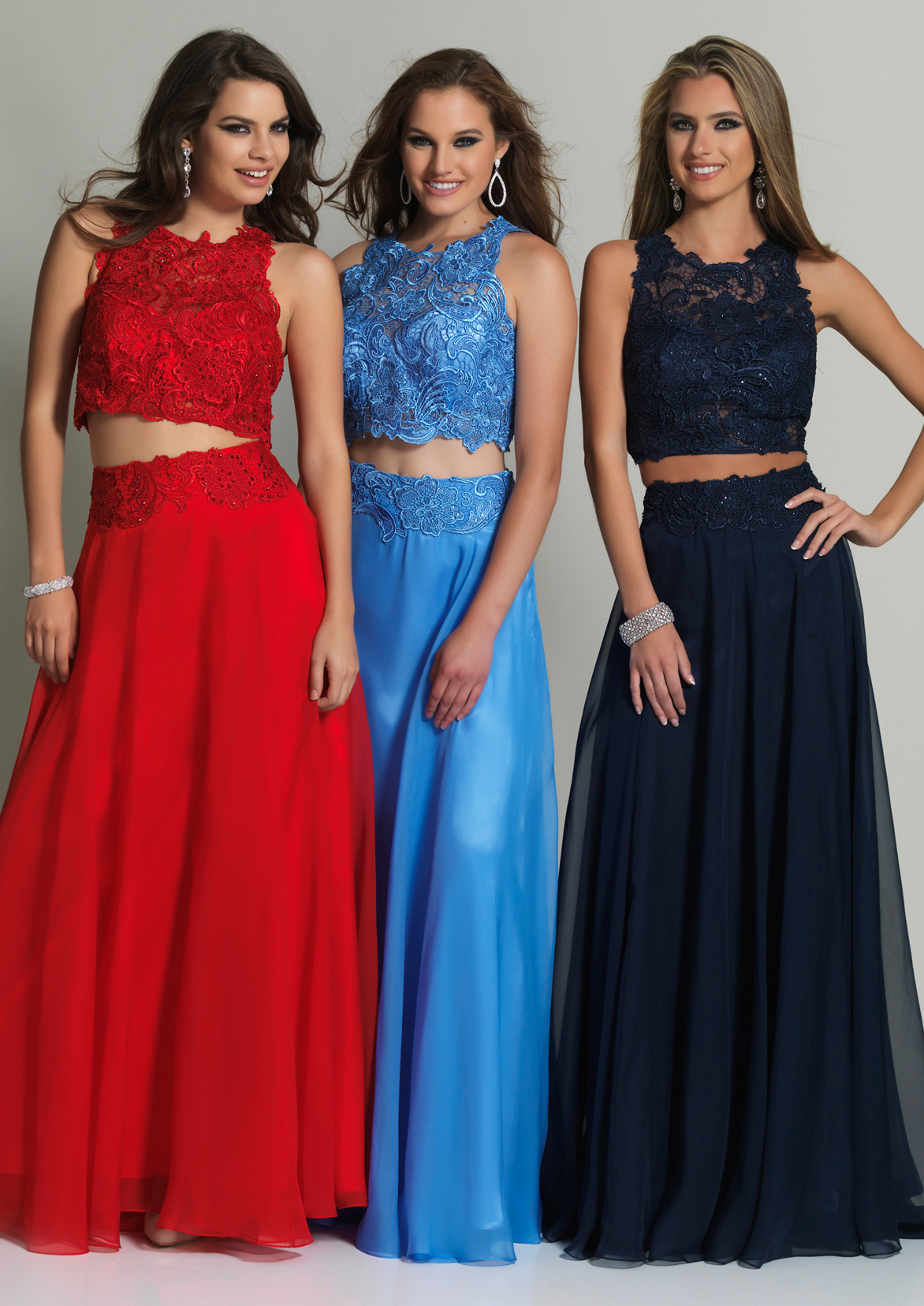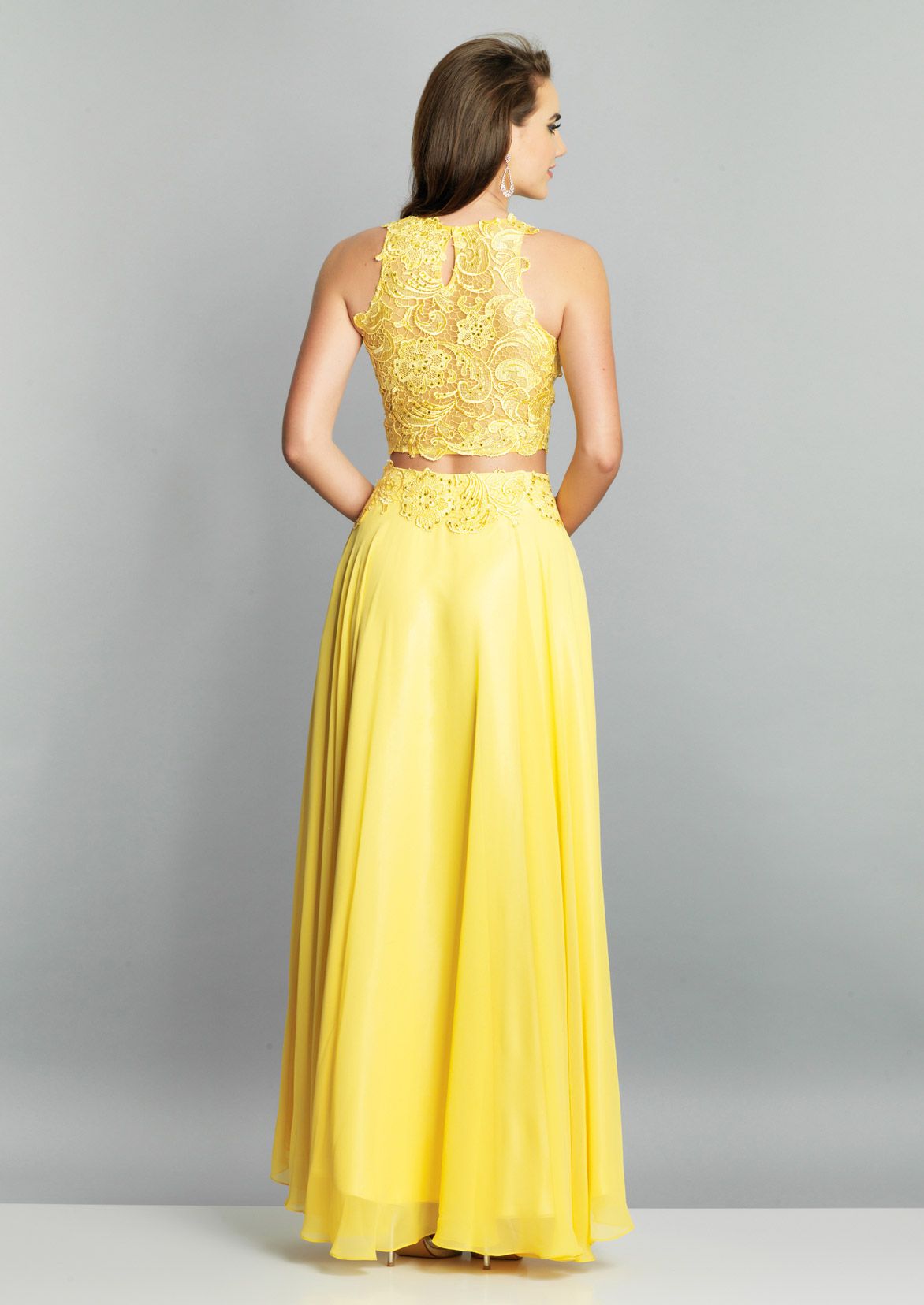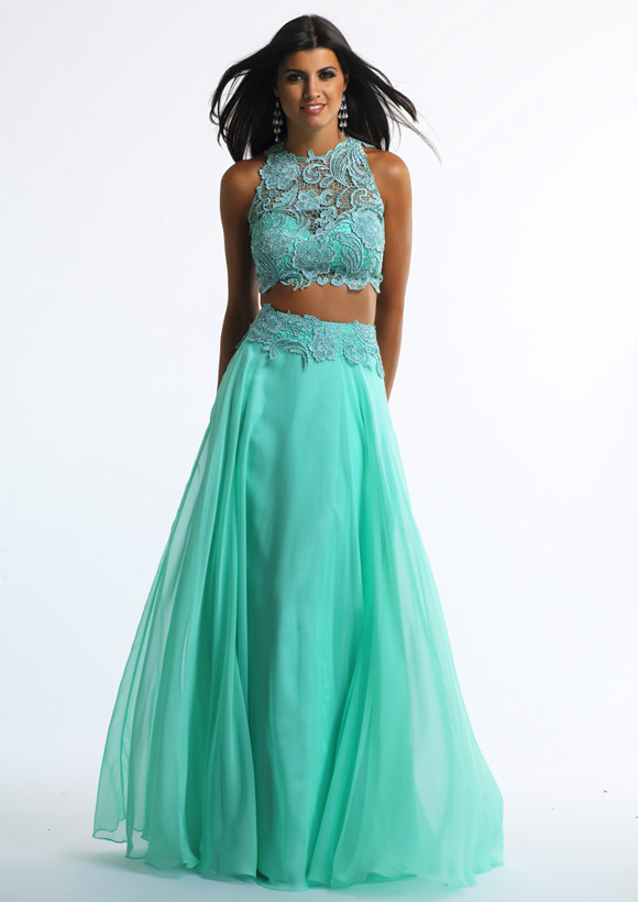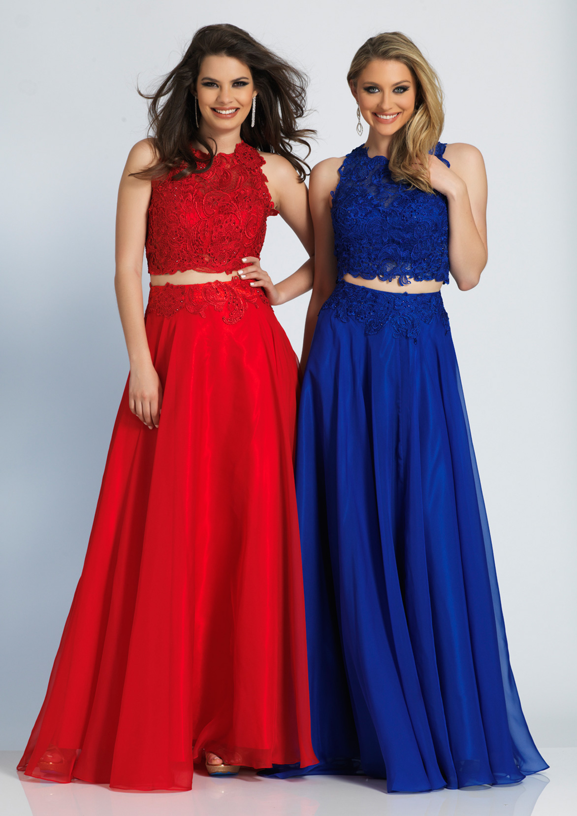 Dave and Johnny Prom Dress 10001W. Two piece chiffon gown with beaded halter top and flowy skirt.