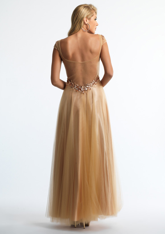 Dave and Johnny Prom Dress 10330. Long tulle dress with sheer sequin top and cap sleeve.