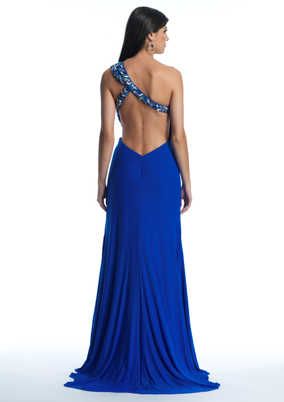 Dave and Johnny Prom Dress 10396. Long jersey dress with beaded shoulder and cut out back.Color Samples