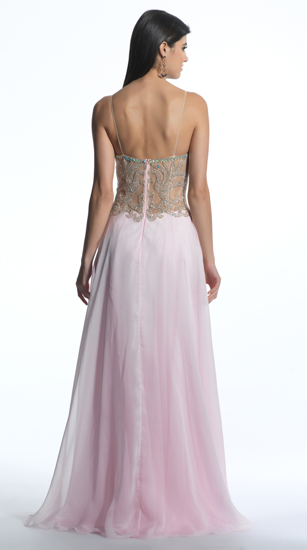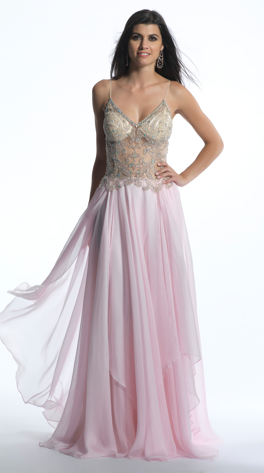 Dave and Johnny Prom Dress 1046. Pink gown with spaghetti straps, sheer and silver beaded bodice, layered chiffon bottom.