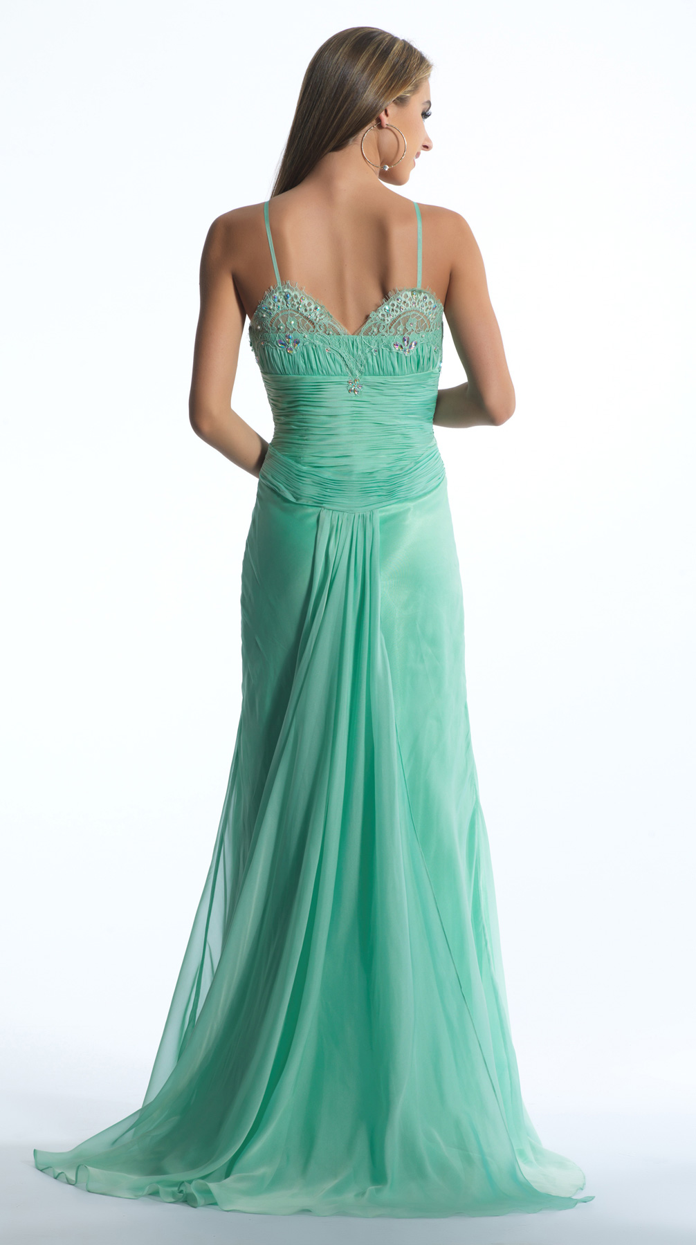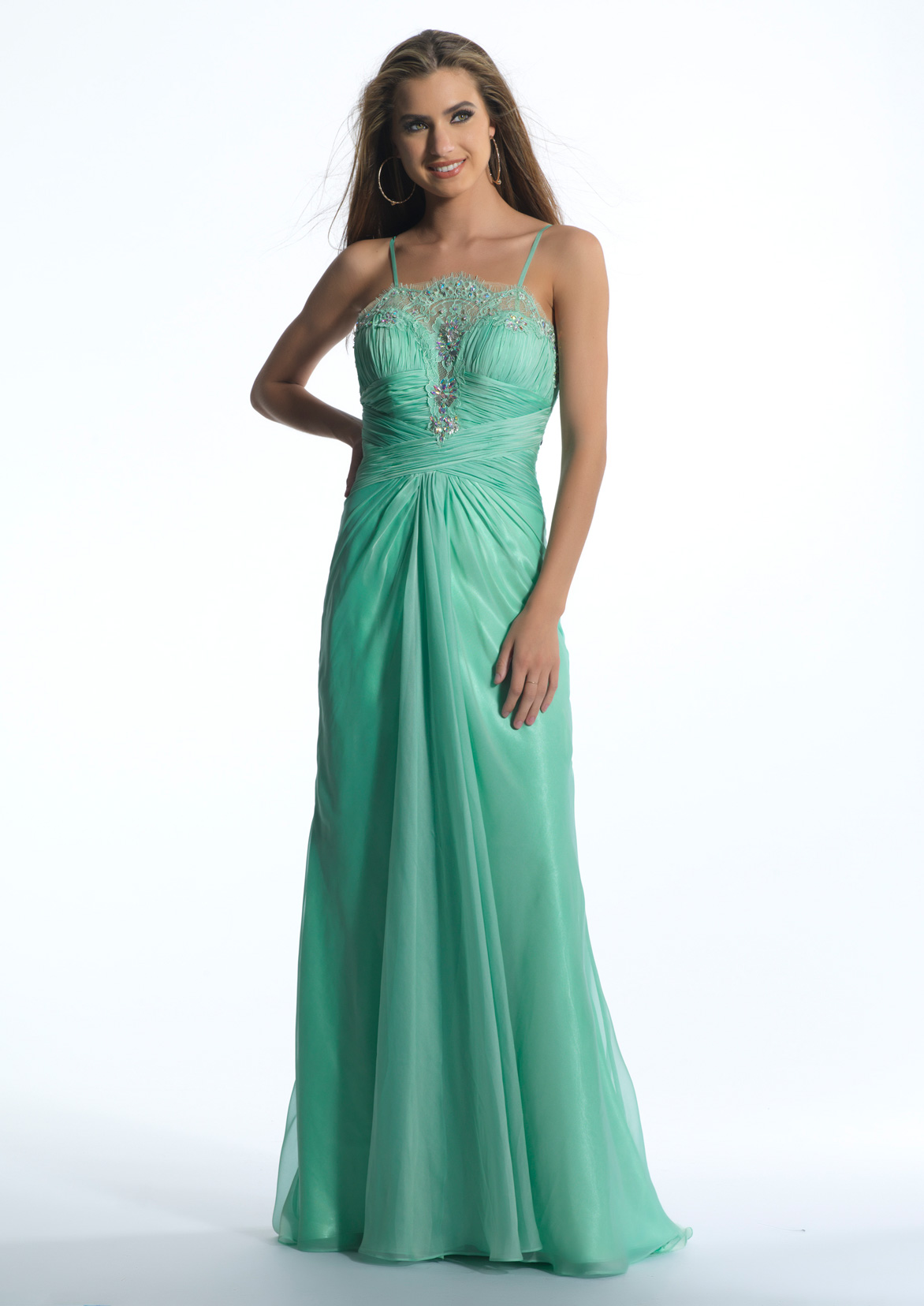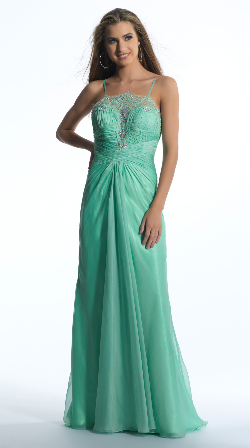 Dave and Johnny Prom Dress 1131. Lace applique neckline and ruched top, tiny straps full length chiffon gown.