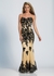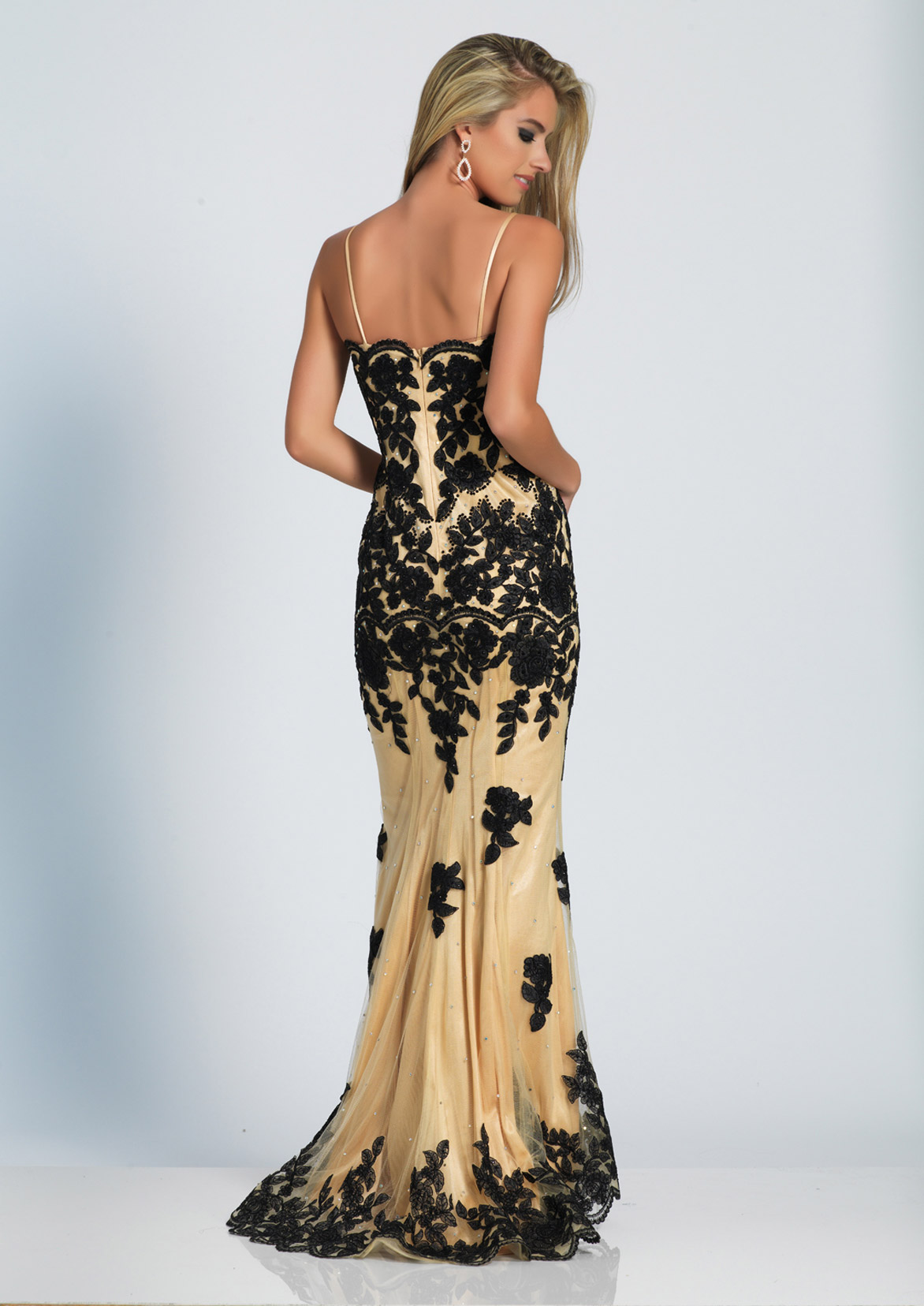 Dave and Johnny Prom Dress 1255. This dress features a slip style, fabric that's layered by a transparent cloth which is adorned with petals dropping from the bodice to the hem. It praises the curves of women with hourglass shaped silhouettes.Fabric: Lace over Tulle