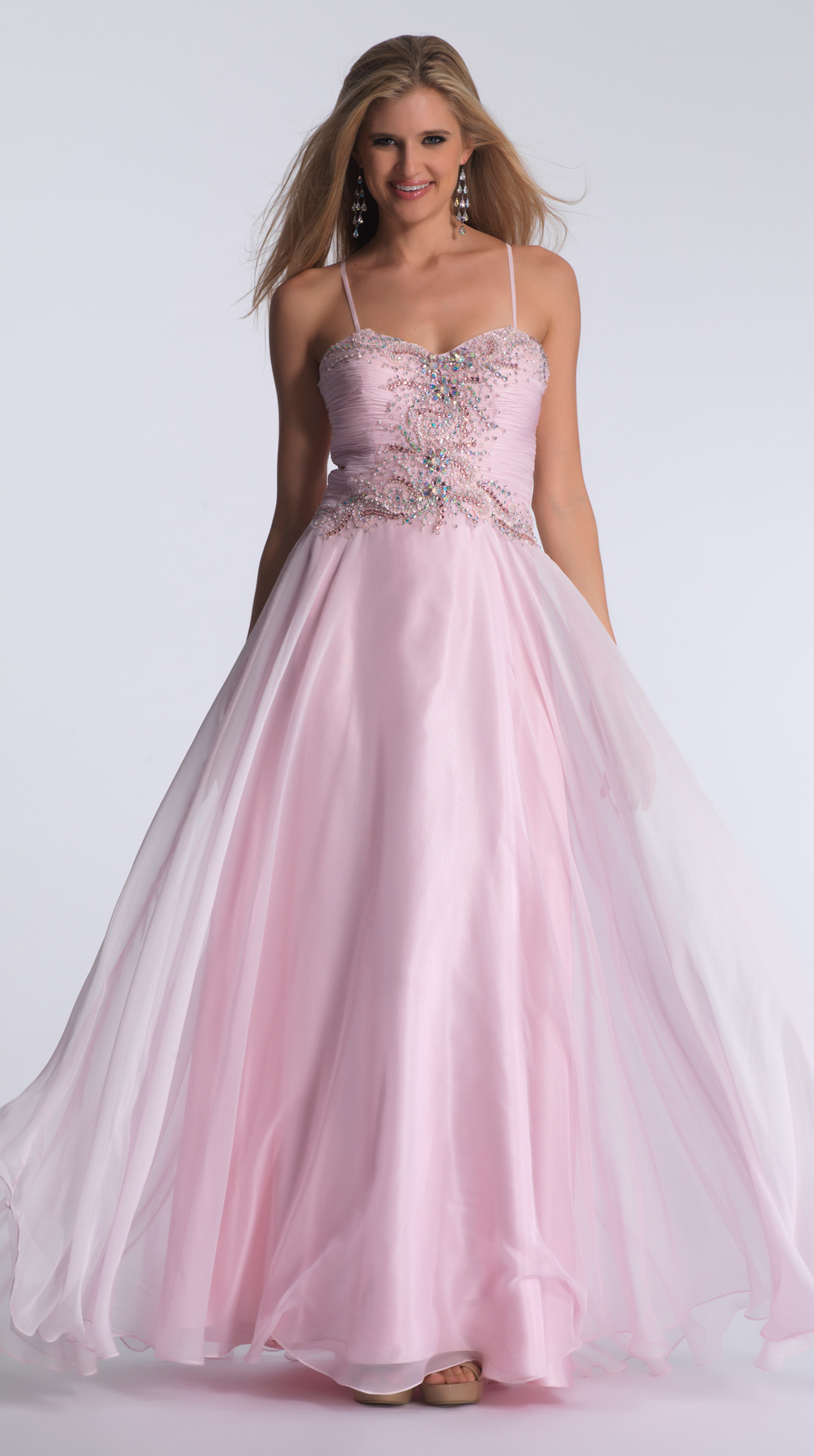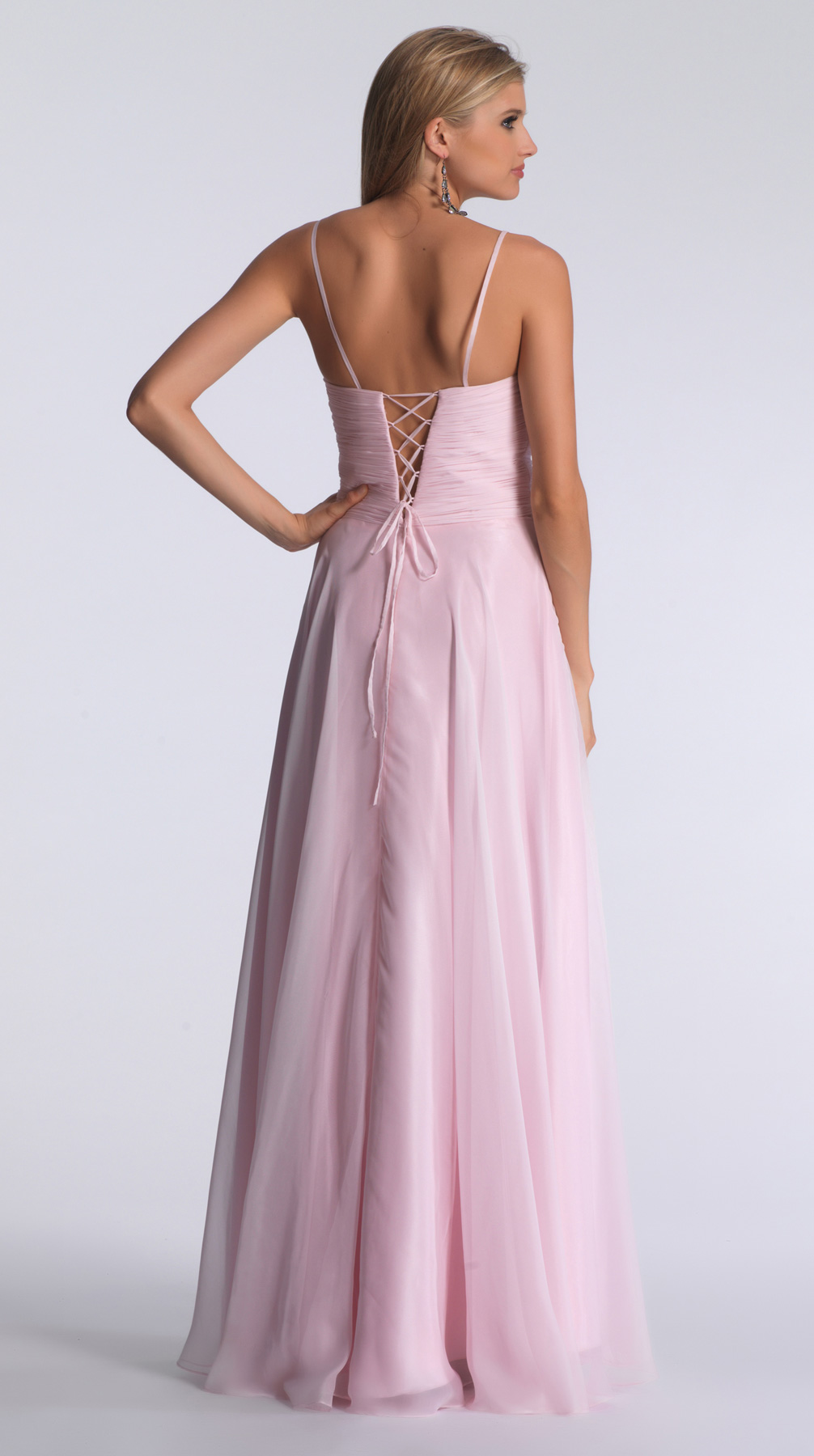 Dave and Johnny Prom Dress 1257. Chiffon pink gown, ruched bodice and corset back.