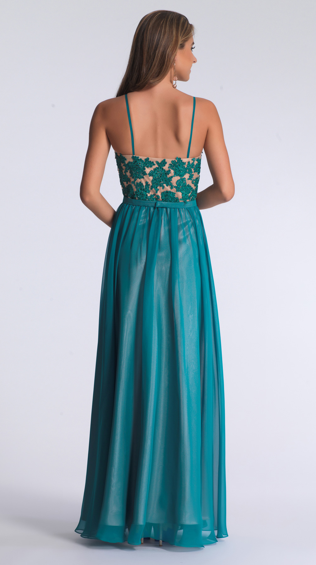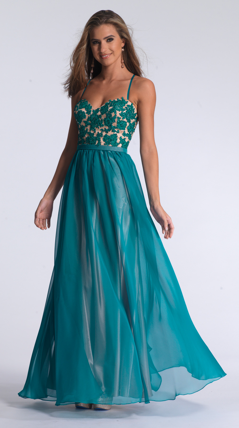 Dave and Johnny Prom Dress 1292. Nude bodice with lace applique, little waist belt and chiffon skirt.