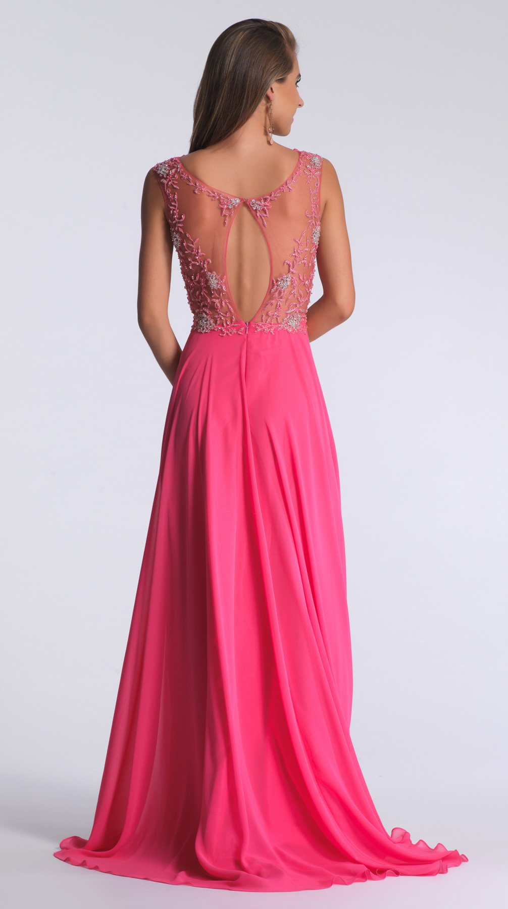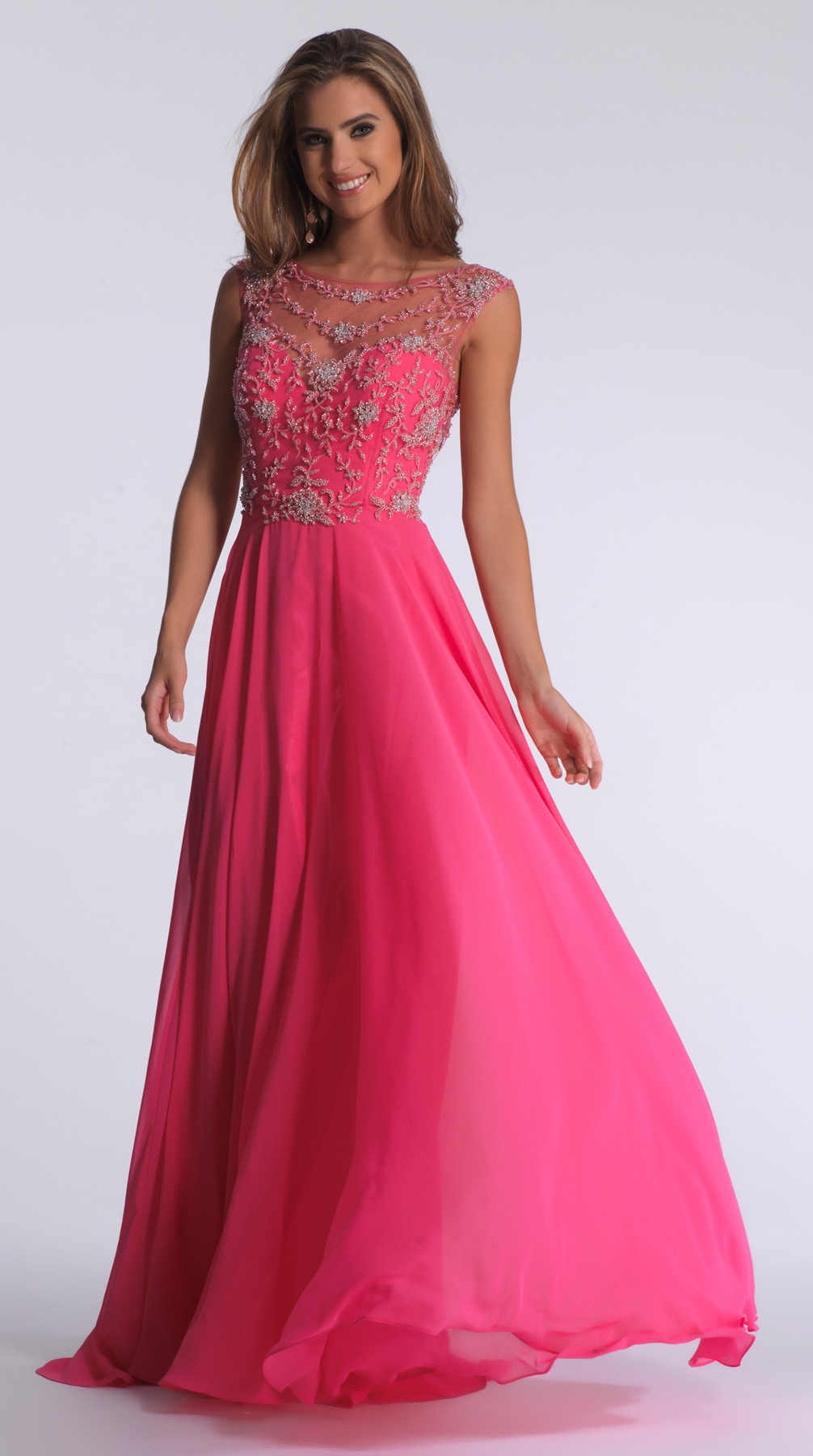 Dave and Johnny Prom Dress 1294. Full length chiffon gown with high waist and floral beading, keyhole back.