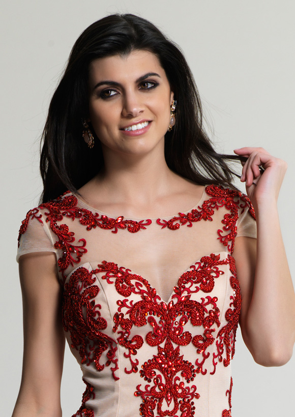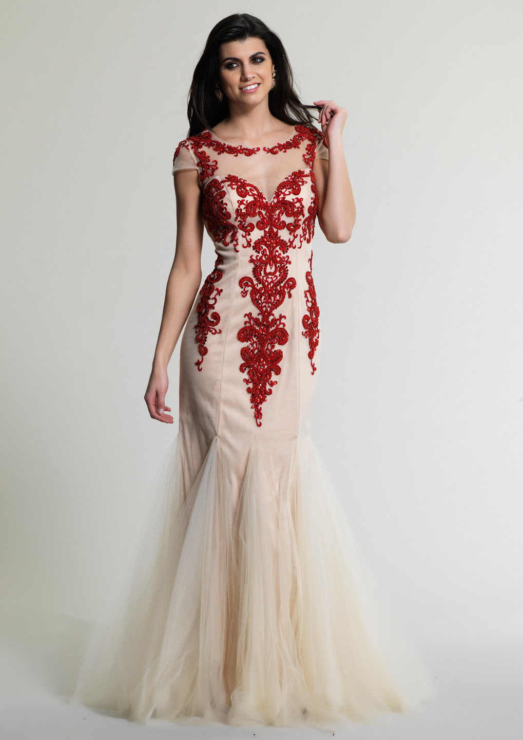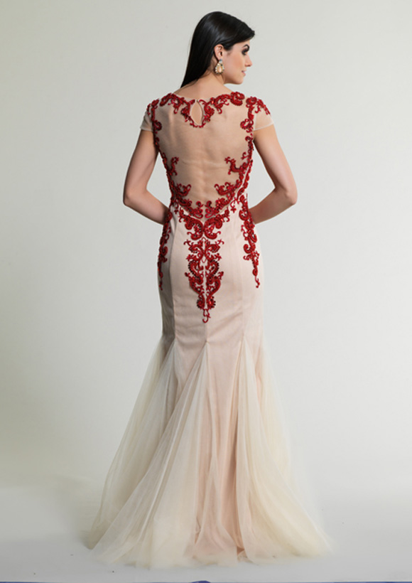 Dave and Johnny Dress 226. Long beaded mesh dress with tulle skirt, crew neck and mesh back.