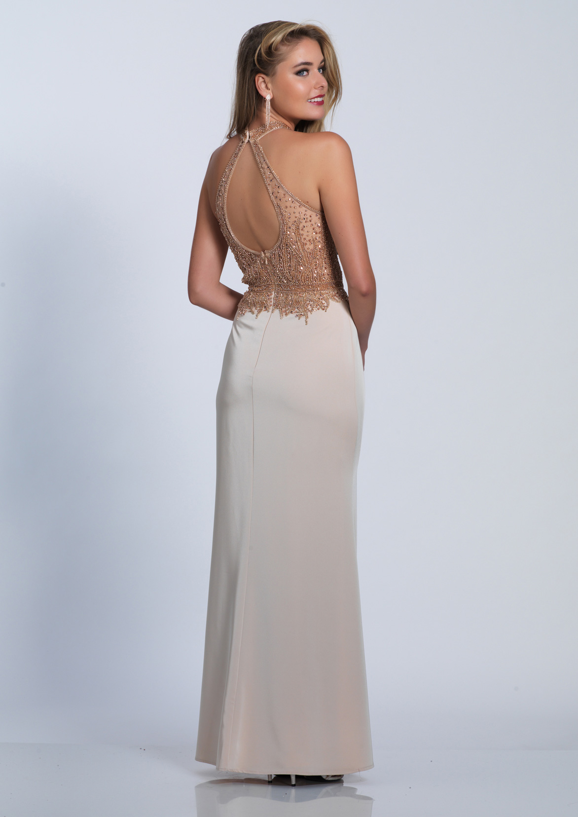 Dave and Johnny Prom Dress 3223. A high neck halter prom gown with a sheer beaded bodice.