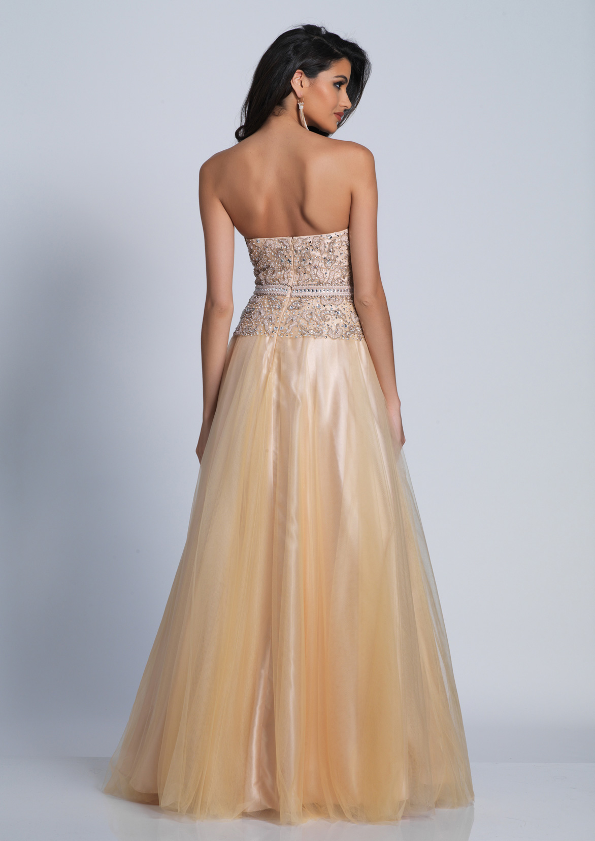 Dave and Johnny Prom Dress 3321. Festooned with jewels on a sculpted and textured strapless bodice, this elegant piece shows off a sweetheart neckline paired with an alluring mid-open back to better flaunt those exquisite shoulders and décolletage. Crowned at the waist with an ornamented slender band, the peplum detail adds a touch of glamourous air into the ensemble. The lustrous A-line skirt streams in soft waves as an overlaying gossamer layer completes it at a full-length hemline.As advertised from the manufacturer: www.Daveandjohnny.com.