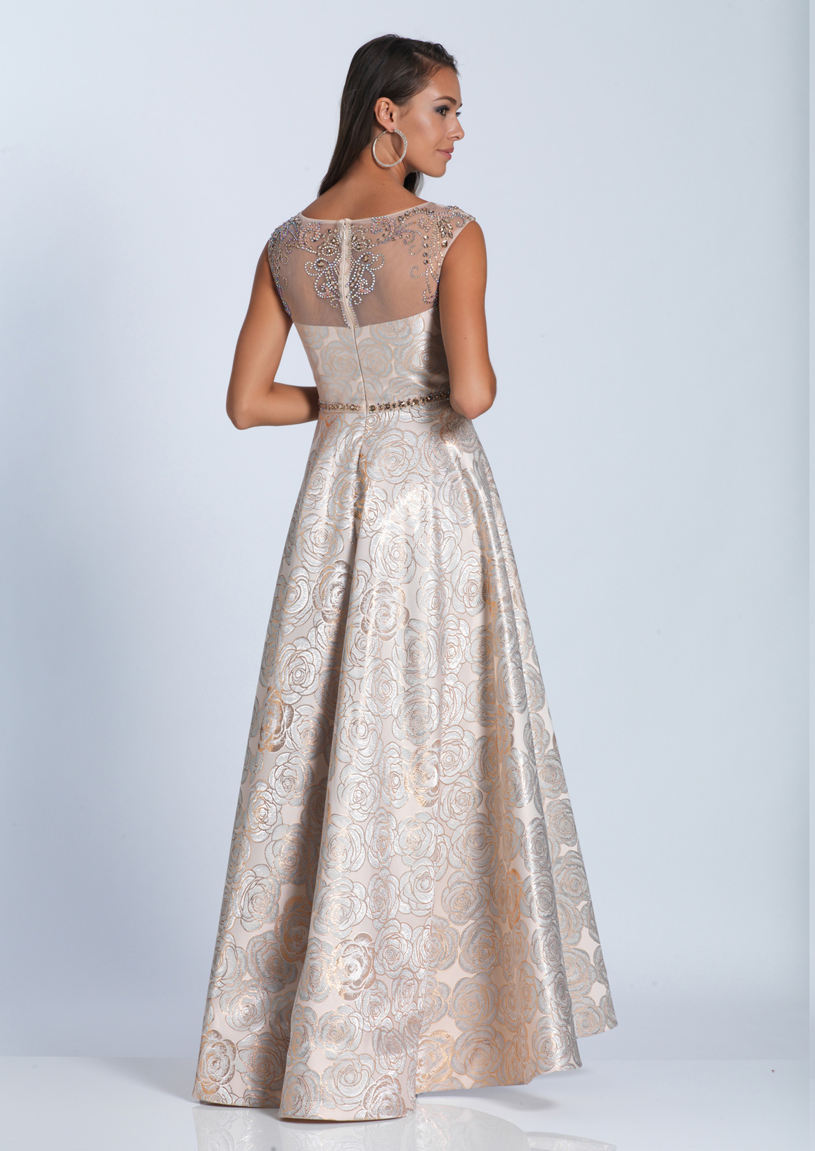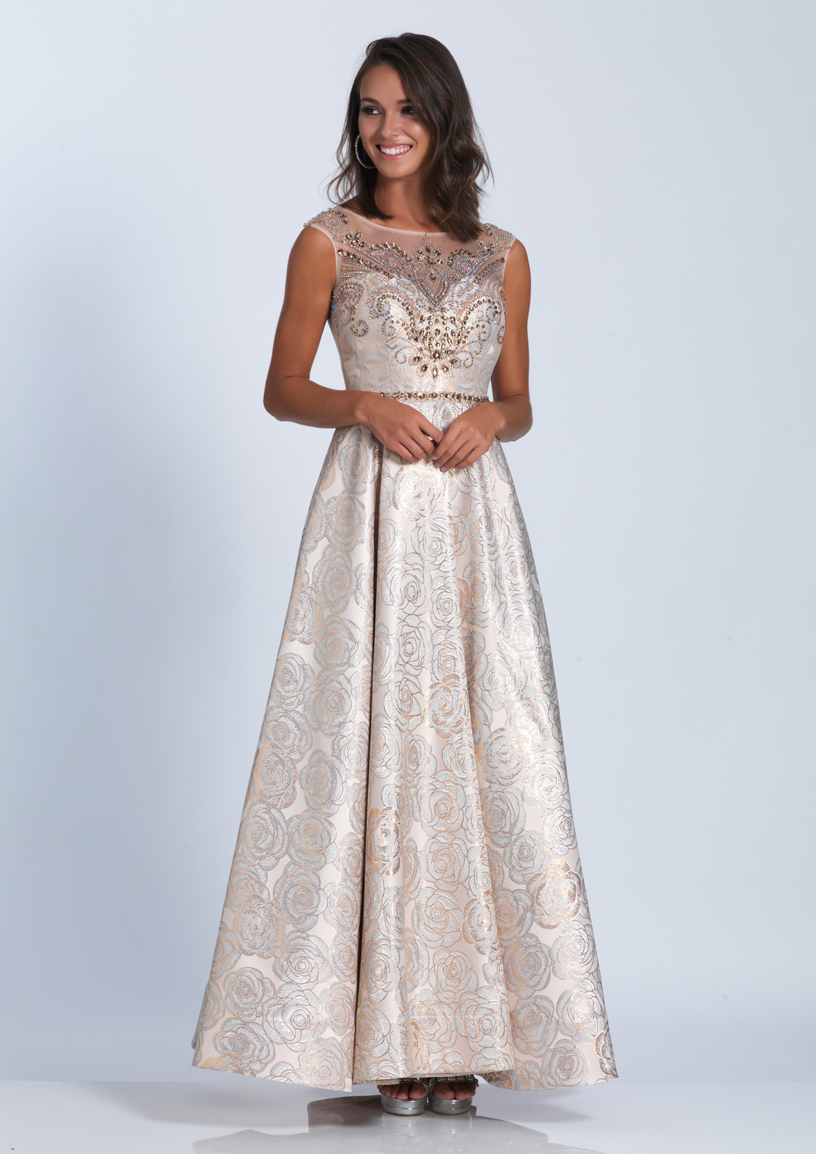 Dave and Johnny Prom Dress 3391. This long formal dress gallants in cap sleeves, illusion bateau neckline with embellishments over the sweetheart lined bodice. The waist is accented with an embellished belt and begins its A-line skirt.As advertised from the manufacturer: www.Daveandjohnny.com.