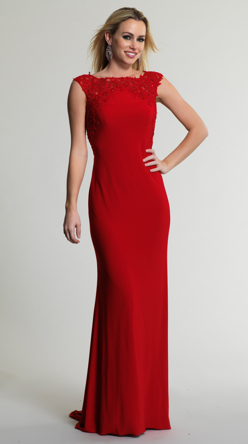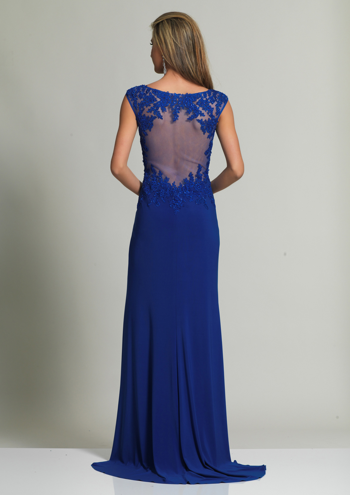 Dave and Johnny Prom Dress 347. Jersey gown with lightly beaded lace applique on the shoulder and sheer back.