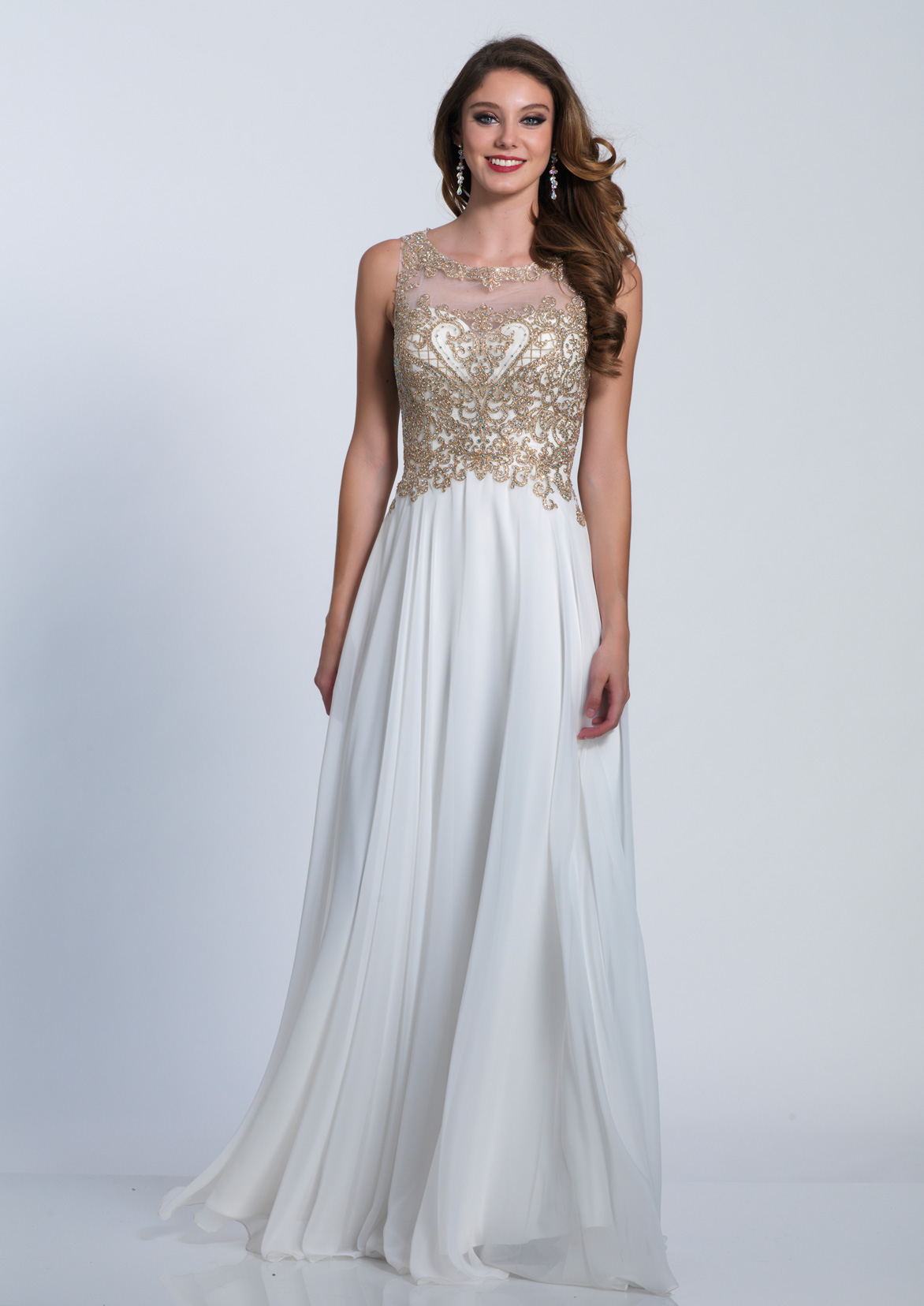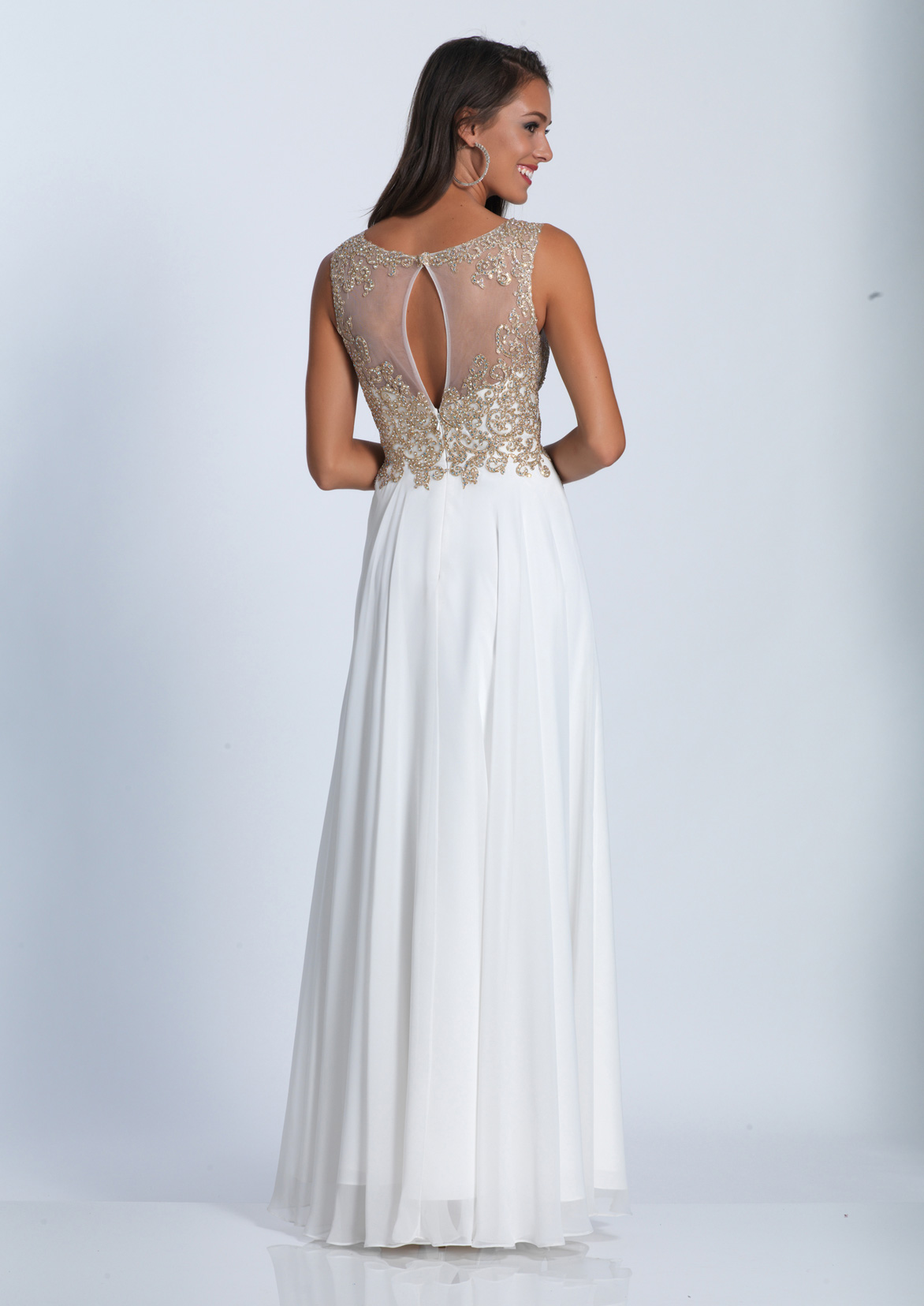 Dave and Johnny Prom Dress 3541. The sleeveless bodice topped with an illusion bateau neckline is adorned with dazzling gold beads. The complementing skirt crafted in chiffon flows gracefully to the floor. A keyhole detail highlights the back with a center zipper closure.As advertised from the manufacturer: www.Daveandjohnny.com.