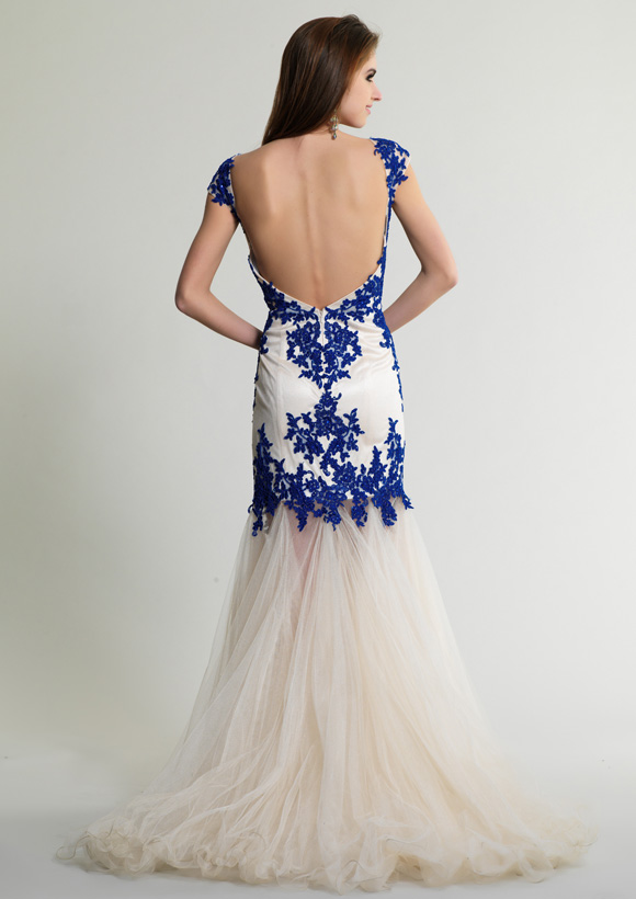 Dave and Johnny Dress 365. Long lace dress with tulle skirt, crew neck and open back.
