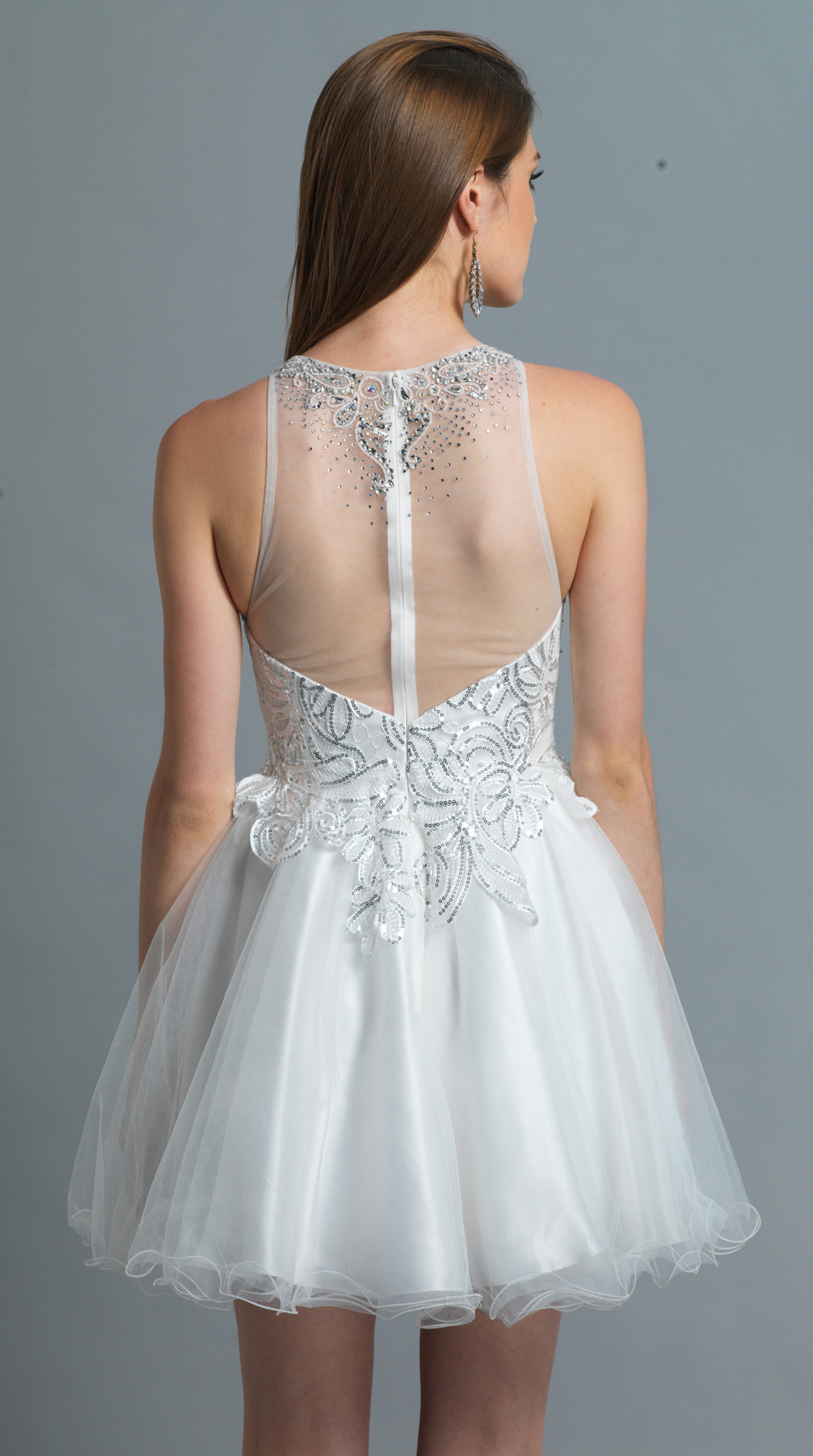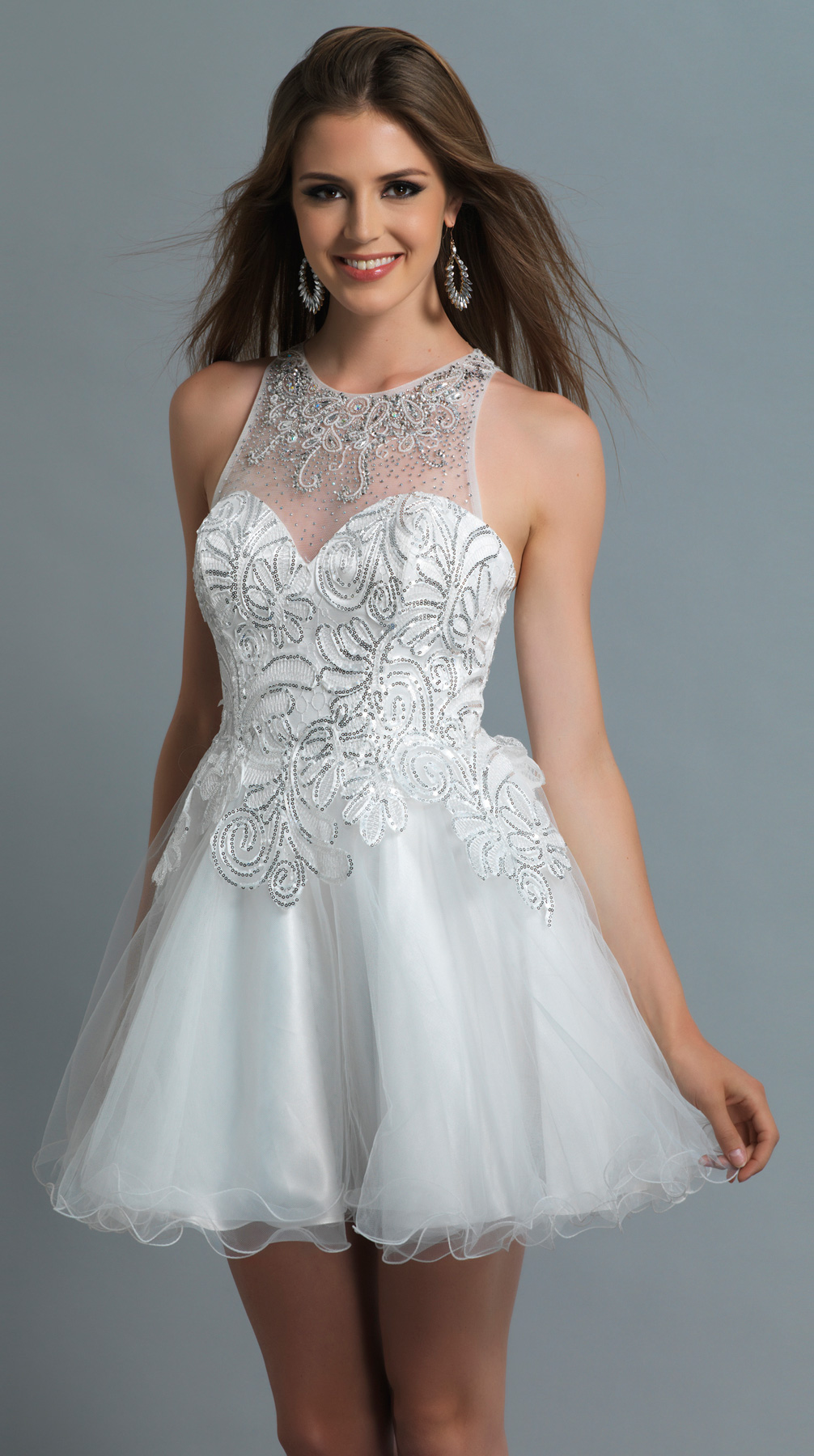 Dave and Johnny Prom Dress 386. Flare tulle skirt dress with beaded illusion neckline, sequin décor on the bodice.