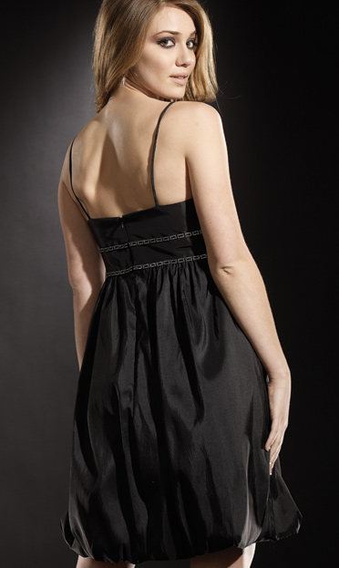 Dave and Johnny style 4317. Short taffeta bubble dress with rhinestone trim empire, a pleated bust and a zipper down center back.Color Samples