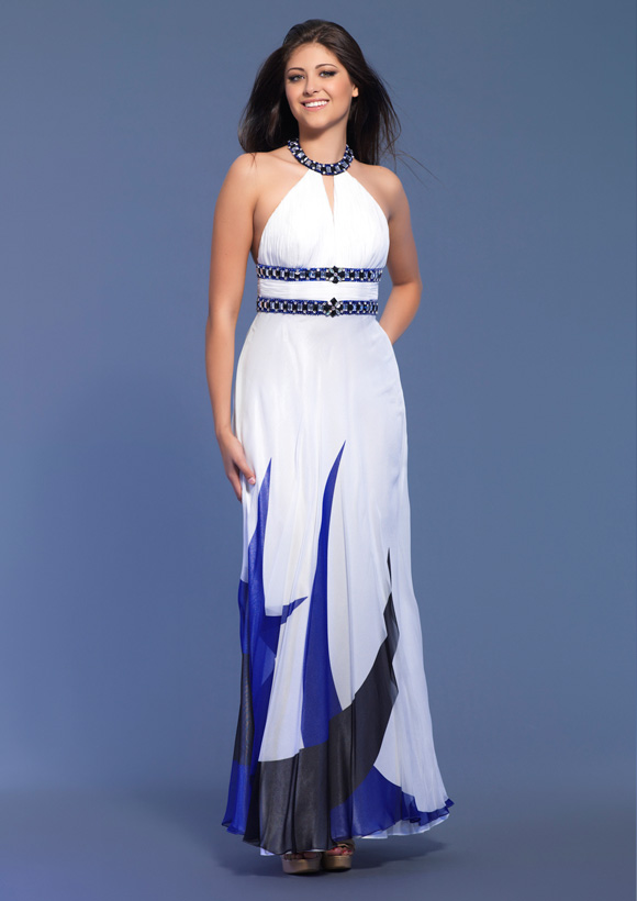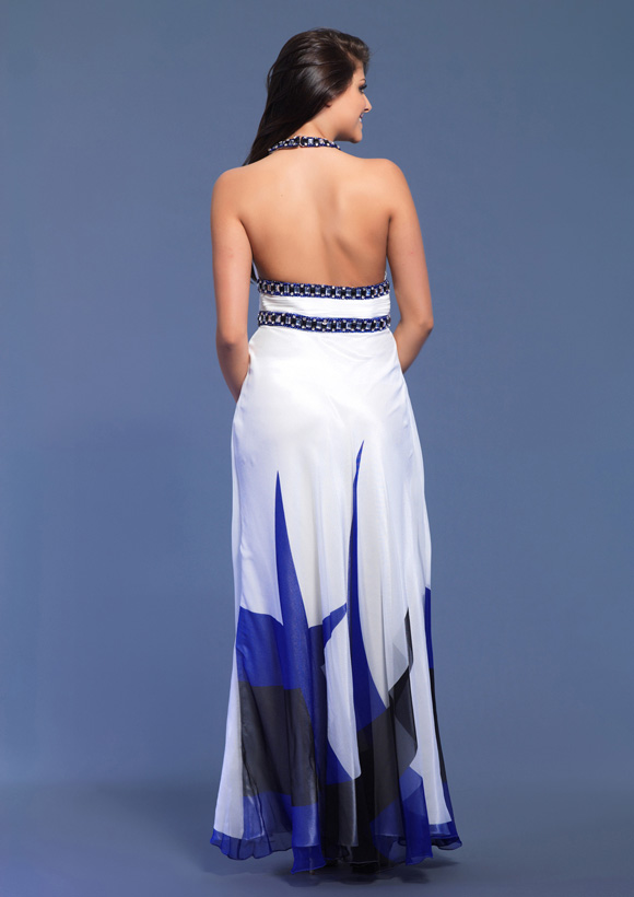 Dave and Johnny style 5413. Chiffon dress with a shirred bust, beaded strap and waist. There is a keyhole front.
