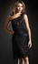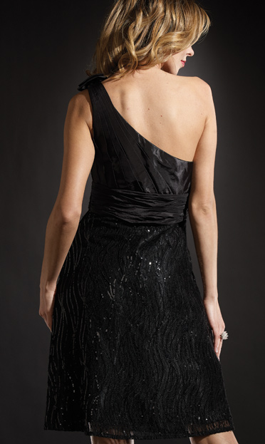 Dave and Johnny style 6083. One shoulder short black dress designed with pleated taffeta top and bow. Sequined mesh skirt.