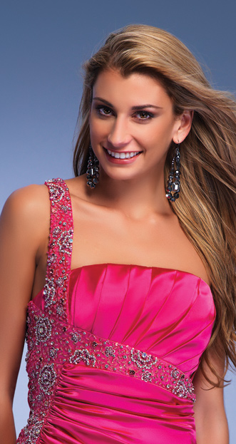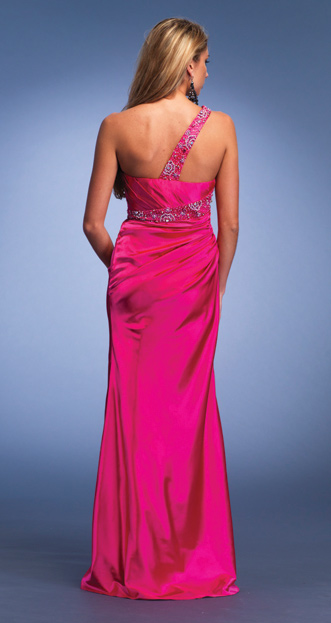 Dave and Johnny style 6115. One shoulder satin charmeuse dress with beading on the bust and strap that continues in the back. This dress hjas a high back and a back zipper.Color Samples