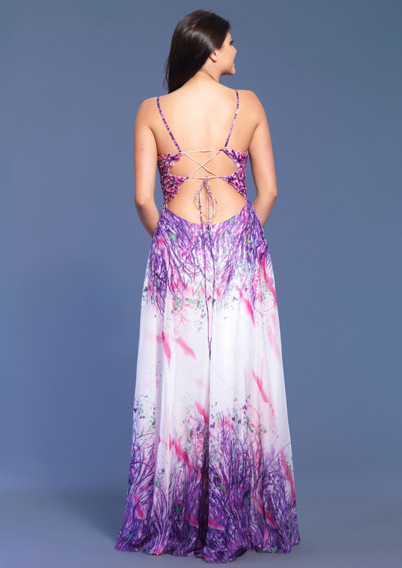 Dave and Johnny style 6277. Spaghetti strap chiffon dress with a shirred bust and beaded empire waistline. This dress has a corsette back.As advertised from the manufacturer: www.Daveandjohnny.com.