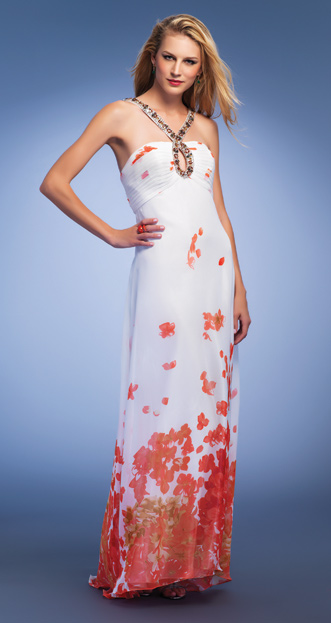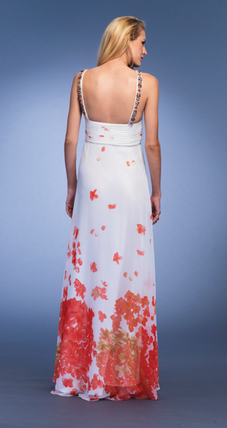 Dave and Johnny style 6358. Print chiffon dress with beaded straps and a keyhole front. This dress has a rouced bust and the zipper is located in the back.As advertised from the manufacturer: www.Daveandjohnny.com.