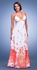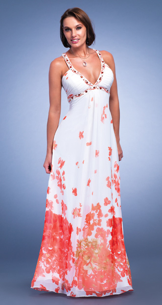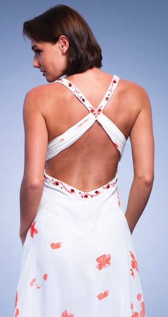 Dave and Johnny style 6364. Print chiffon dress with beaded straps and empire waist. This dress has an open back and a rouched bust.As advertised from the manufacturer: www.Daveandjohnny.com.