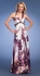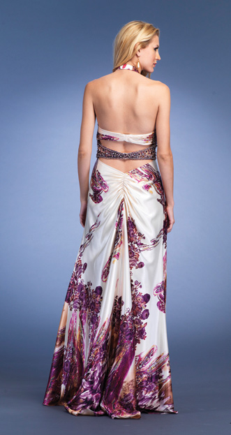 Dave and Johnny style 6374. Print satin charmeuse halter dress with a beaded empire waist and a cut out back. This dress has a v-neck front.As advertised from the manufacturer: www.Daveandjohnny.com.