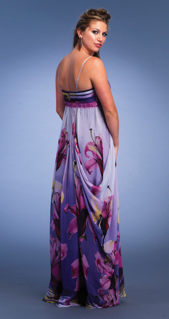 Dave and Johnny style 6528. Print chiffon dress with a pleated top and beading on the empire waist. This dress has chiffon draped from the front to the back as well as a zipper in the back.As advertised from the manufacturer: www.Daveandjohnny.com.