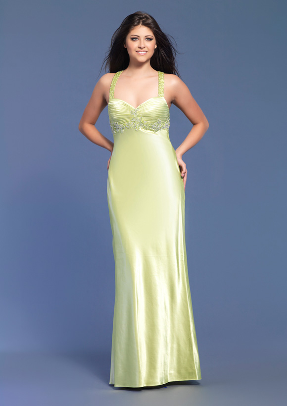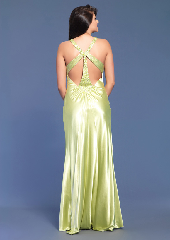 Dave and Johnny style 6610. Charmeuse dress with a rouched bust and beaded straps. This dress has beading on the bust and back.Color Samples
