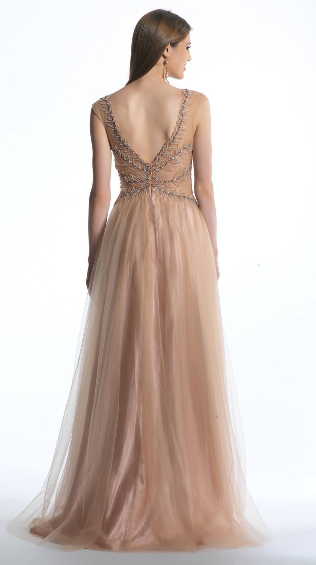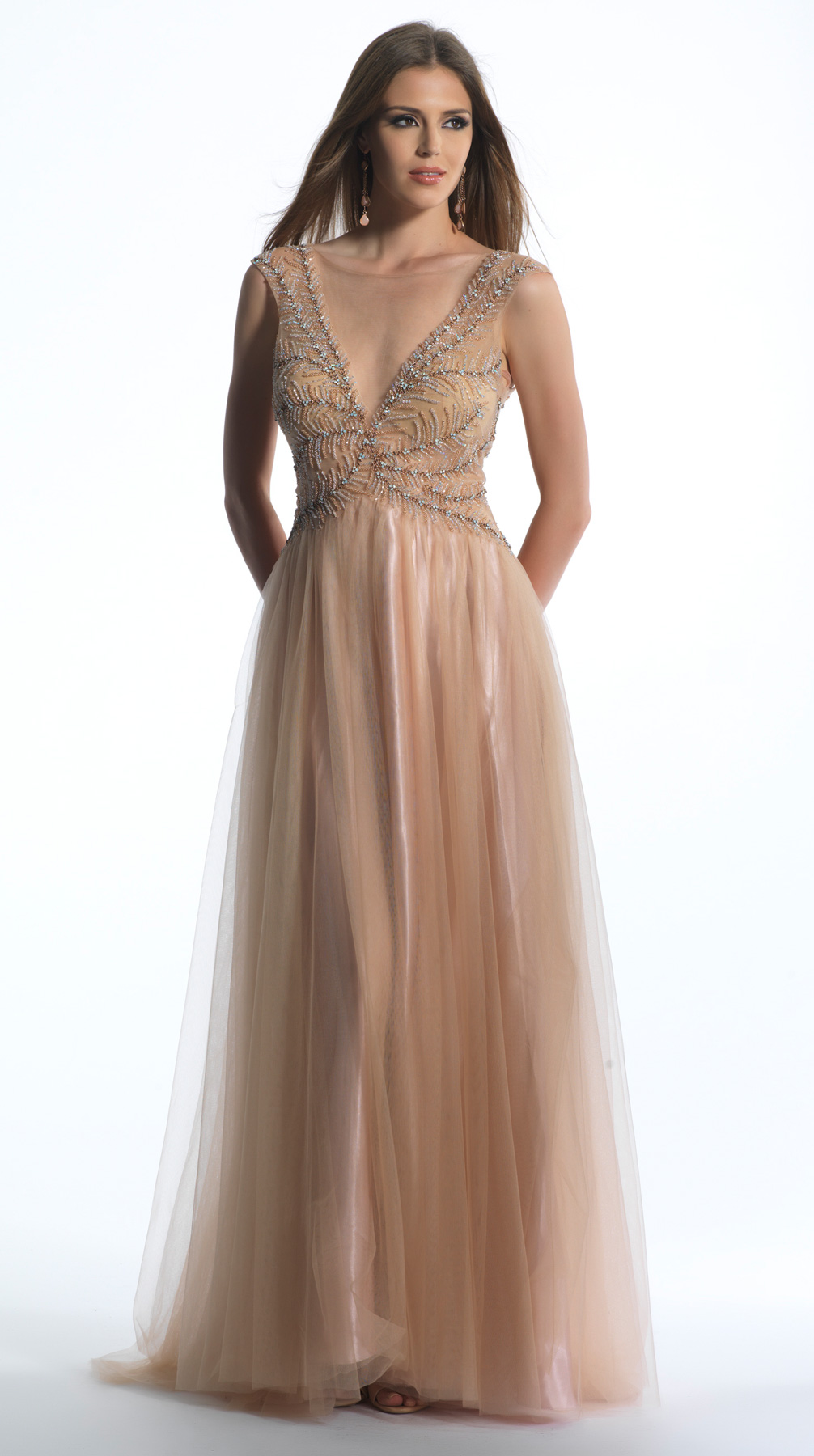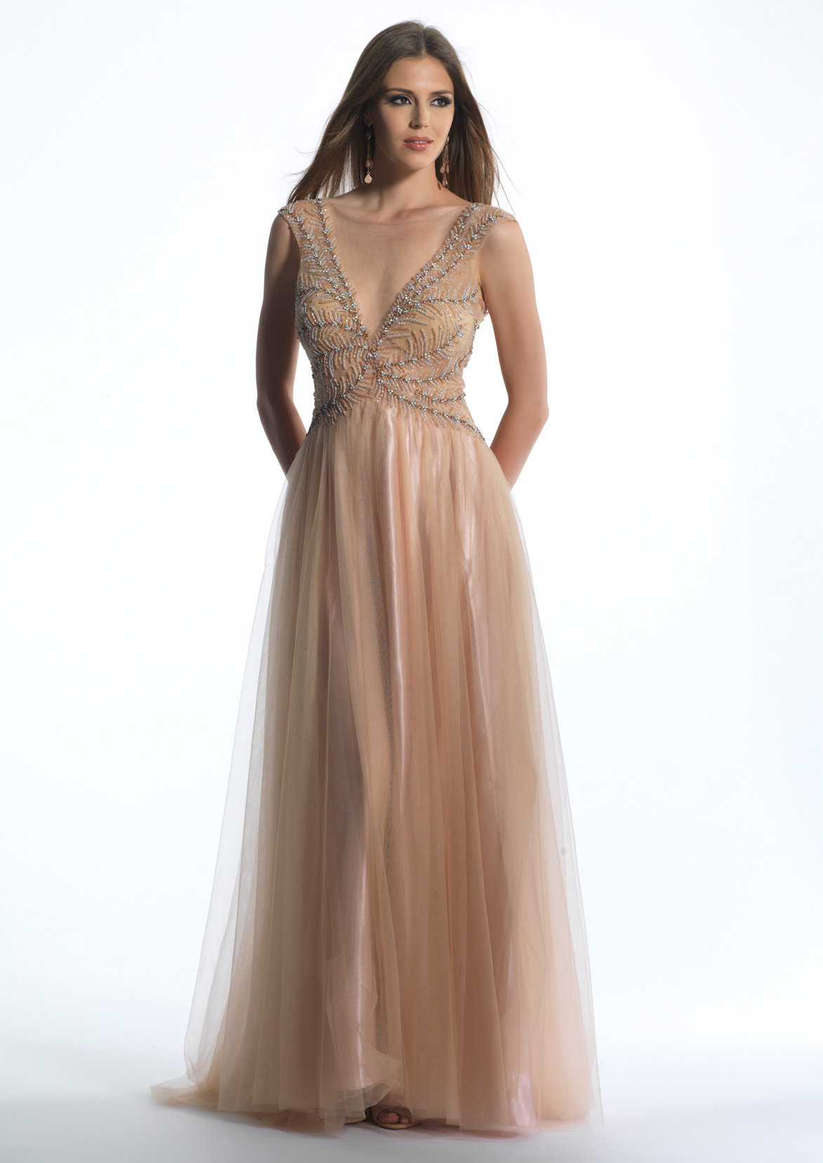 Dave and Johnny Prom Dress 662. All nude ball gown with V-neck and tulle bottom.