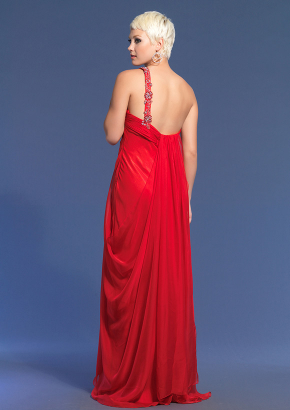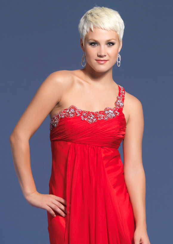 Dave and Johnny style 6856. One shoulder chiffon dress with a rouched beaded top and flowy bottom. This Dress has a side zipper.As advertised from the manufacturer: www.Daveandjohnny.com.