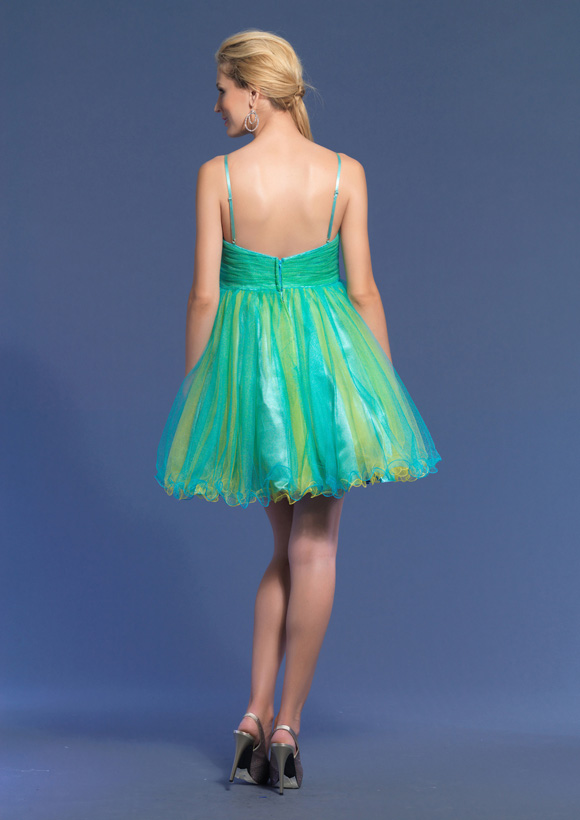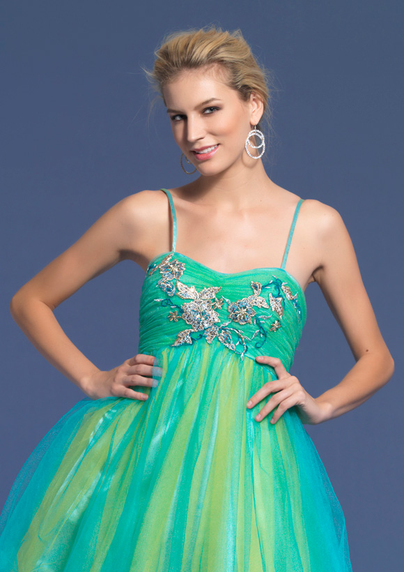 Dave and Johnny style 6910. Cocktail halter tulle dress with a shirred bust, a keyhole front and applique detail on the top. This dress has a back zipper.As advertised from the manufacturer: www.Daveandjohnny.com.
