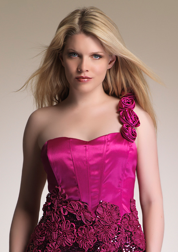 Dave and Johnny style 6924. Short dress with a corsette top with a ribbon flower detail. This dress has a sequined bottom, a lace up back and a flower on the one shoulder.As advertised from the manufacturer: www.Daveandjohnny.com.