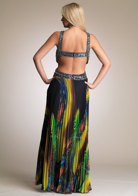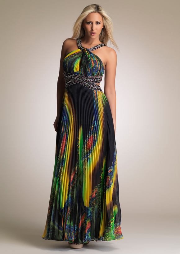 Dave and Johnny style 6951. Print all over pleated chiffon dress with a keyhole and a shirred top. This dress has a beaded empire waistline and a straps.As advertised from the manufacturer: www.Daveandjohnny.com.