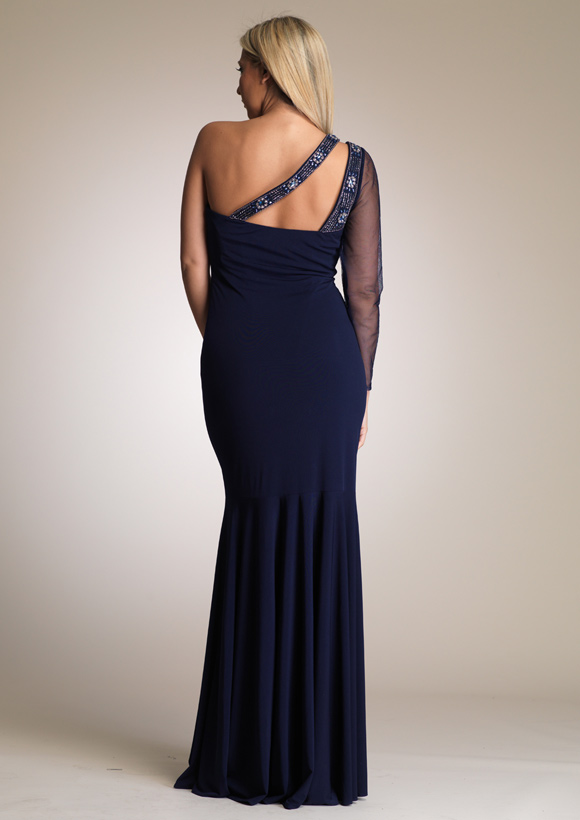 Dave and Johnny style 6975. Long stretch metallic jersey with a tulle sleeve and beaded back straps. This dress has a side zipper.As advertised from the manufacturer: www.Daveandjohnny.com.