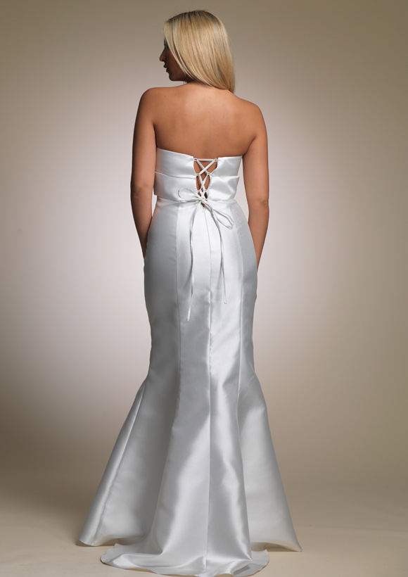 Dave and Johnny style 6980. Long twill satin strapless dress with a train. This dress has a bow detail on the top and a lace up back.As advertised from the manufacturer: www.Daveandjohnny.com.