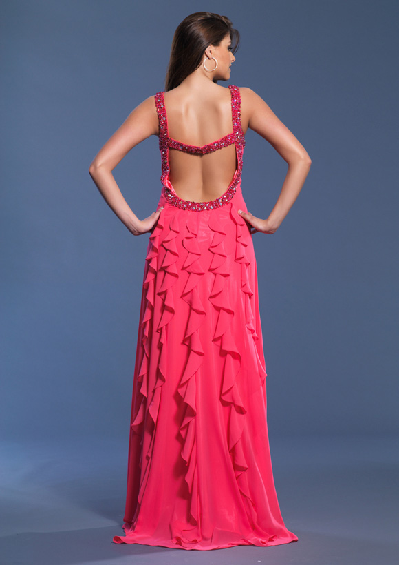 Dave and Johnny style 7004. Chiffon dress with a shirred bust. This dress has beading on the straps and back, has an open back and a side zipper.As advertised from the manufacturer: www.Daveandjohnny.com.