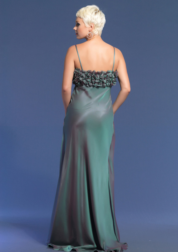Dave and Johnny style 7172. Spaghetti strap chiffon dress with a flower beaded bust and a sweetheart neckline. This dress has a side zipper.As advertised from the manufacturer: www.Daveandjohnny.com.