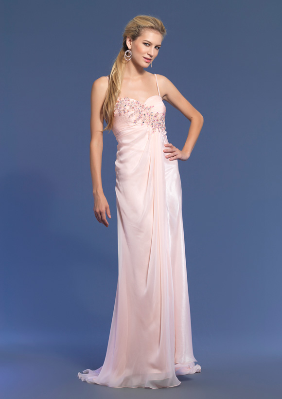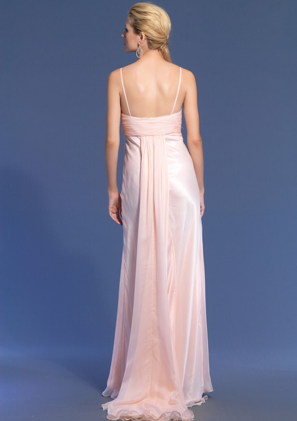 Dave and Johnny style 7276. Charmeuse dress with a rouched bust and beaded mesh straps. This dress has a slit.Color Samples