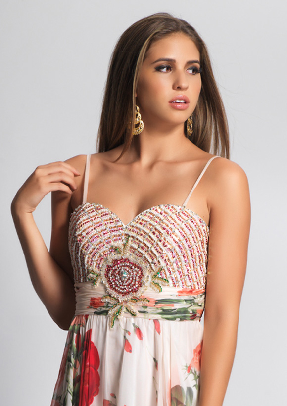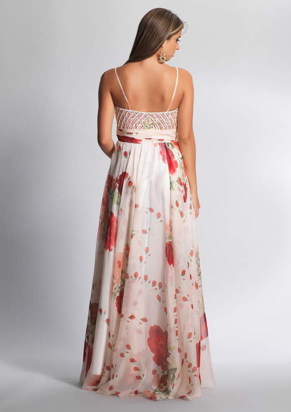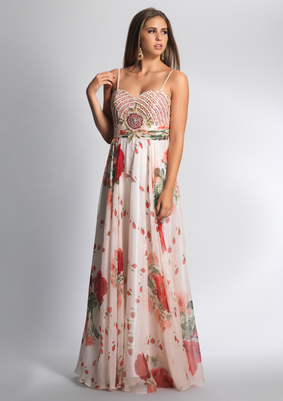 Dave and Johnny Prom Dress 7293. Long Print chiffon with shirred waist band and beaded bust.