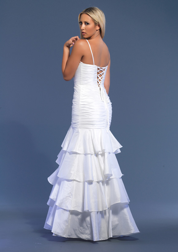 Dave and Johnny style 7392. Fitted taffeta dress with a shirred beaded bust and layered skirt. This dress has a corsette back.As advertised from the manufacturer: www.Daveandjohnny.com.