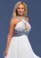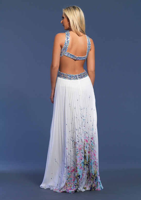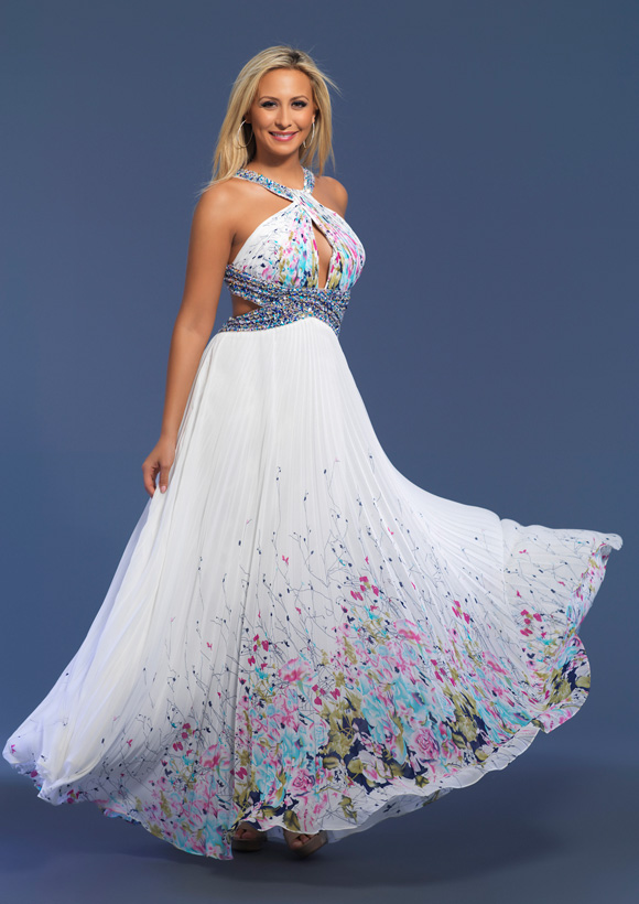 Dave and Johnny style 7397. Print all over pleated chiffon dress with a keyhole and a shirred top. This dress has a beaded empire waistline and a straps.As advertised from the manufacturer: www.Daveandjohnny.com.