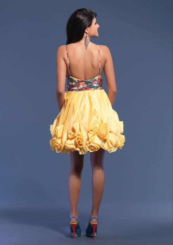 Dave and Johnny style 7539. Spaghetti strap taffeta dress with a sweetheart neckline. This dress is a-line.