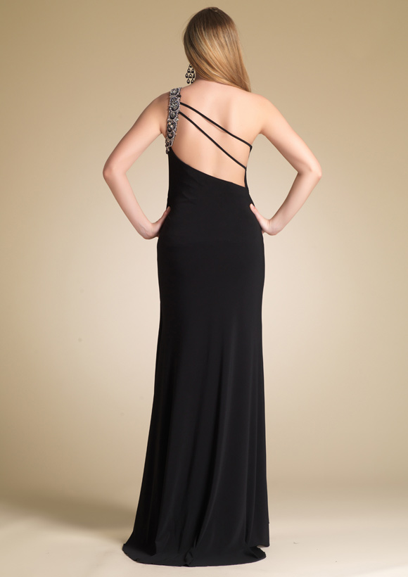 Dave and Johnny Prom Dress 7545. Black matte jersey long dress, chunky silver stones embellishment on shoulder strap and on opposite side under bust line for a cinched waist that holds a flowy chiffon sash. Ladder design on the back.As advertised from the manufacturer: www.Daveandjohnny.com.