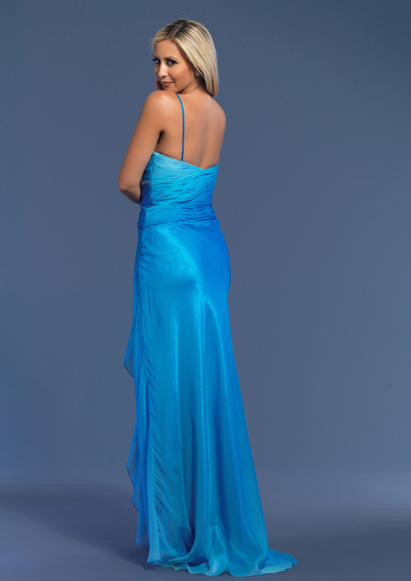 Dave and Johnny style 7576. Ombre chiffon dress with a rouched bodice. This dress has a sweetheart neckline and a high back.
