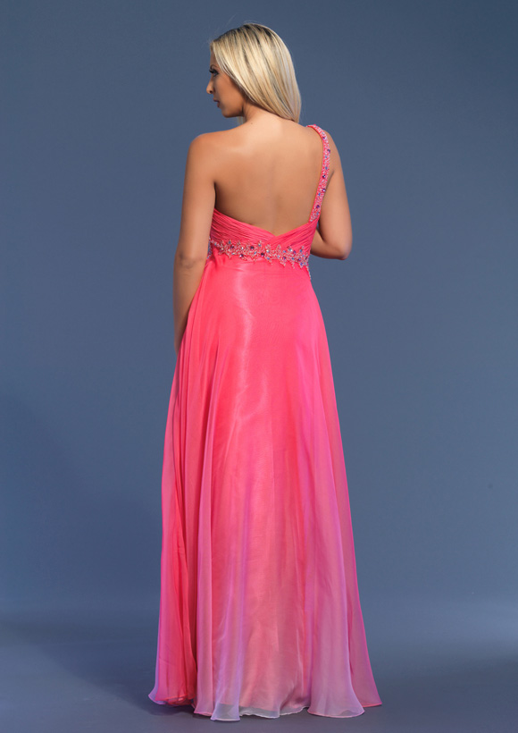 Dave and Johnny style 7584. One shoulder ombre chiffon dress with a rouched sweetheart neckline. This dress has a beaded waistline.As advertised from the manufacturer: www.Daveandjohnny.com.