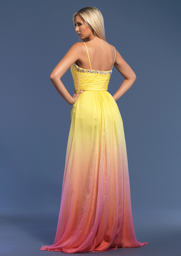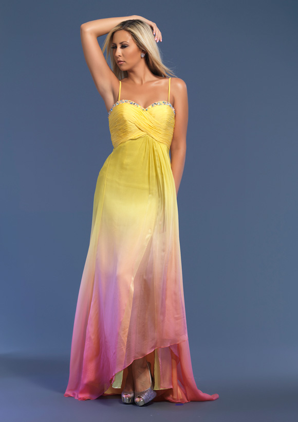 Dave and Johnny style 7601. Sweetheart rouched bust with embellishment on the waist. This dress is ombre and has a back zipper.As advertised from the manufacturer: www.Daveandjohnny.com.