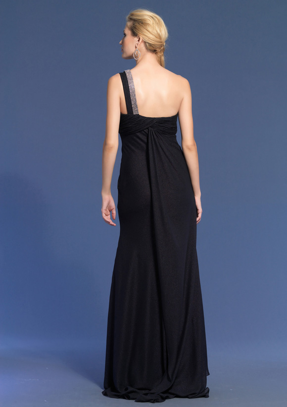Dave and Johnny style 7627. One shoulder metallic chiffon dress with a shirred beaded bust. This dress has a side zipper.