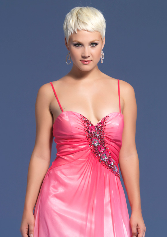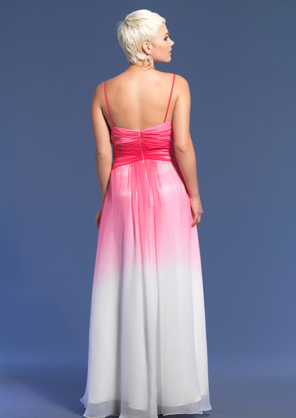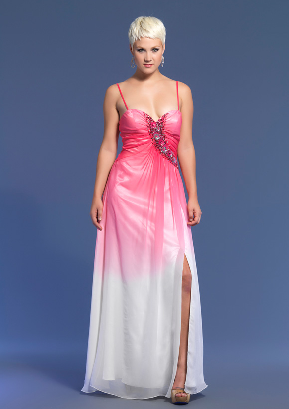 Dave and Johnny style 7646. Spaghetti strap ombre chiffon dress with a beaded sweetheart neckline. This dress has a slit.