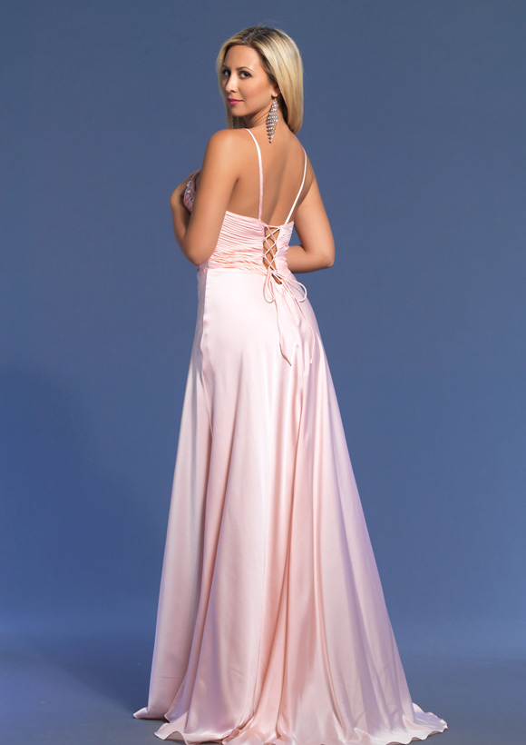 Dave and Johnny style 7678. Spaghetti strap satin dress with a rouched beaded top. This dress has a corsette back.