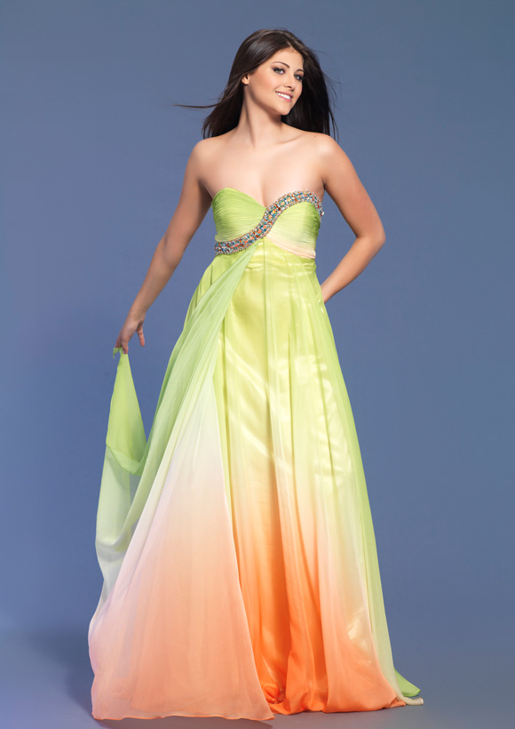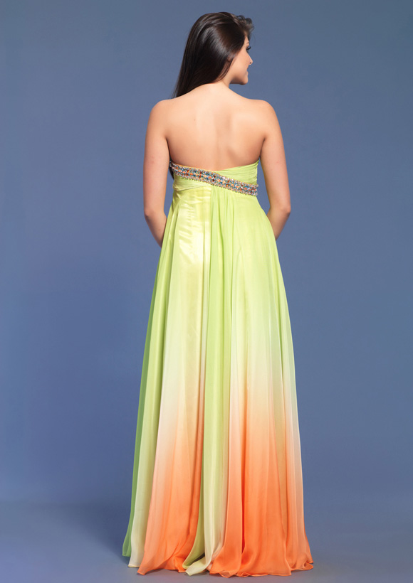 Dave and Johnny style 7684. Strapless ombre chiffon dress with a rouched bust. The top of the dress is beaded and the skirt is a-line.As advertised from the manufacturer: www.Daveandjohnny.com.