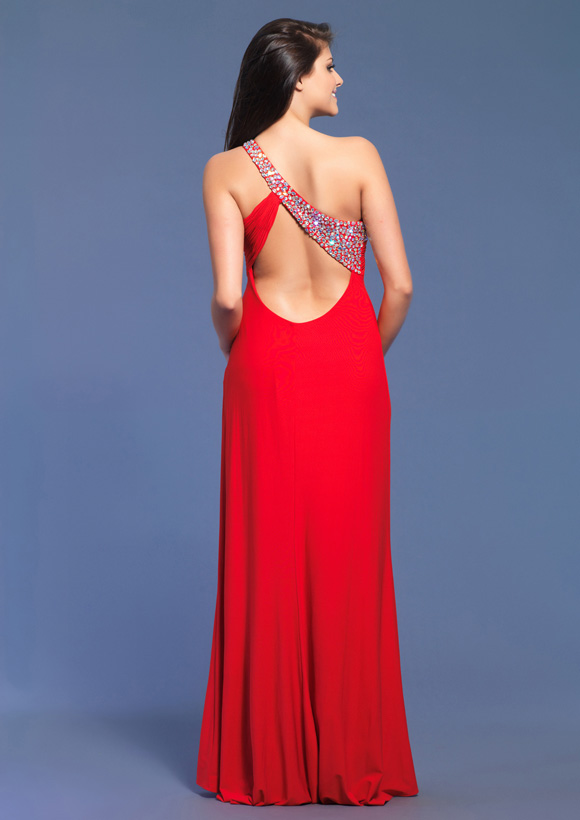 Dave and Johnny style 7688. One shoulder matter jersey dress with a rouched bust and jeweled strap. This dress has a side zipper.As advertised from the manufacturer: www.Daveandjohnny.com.